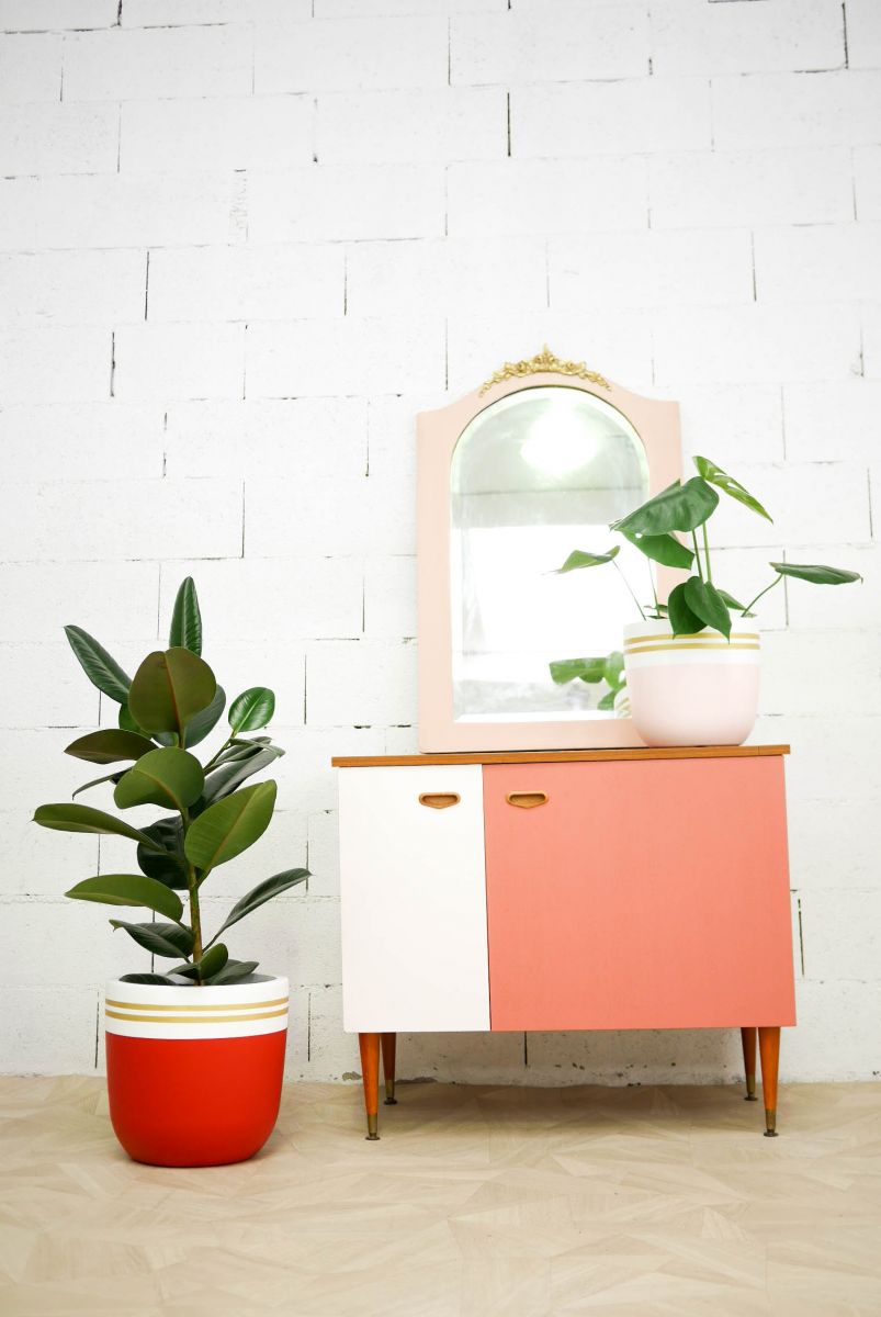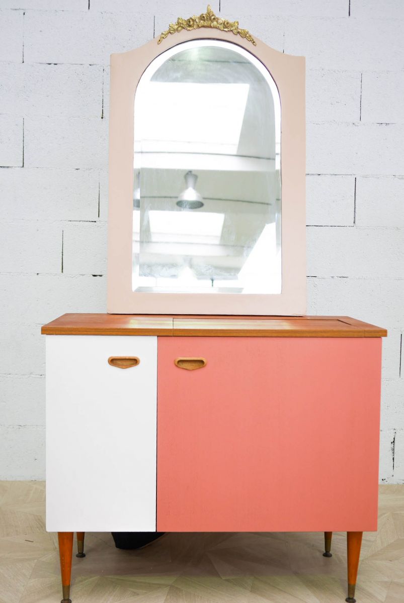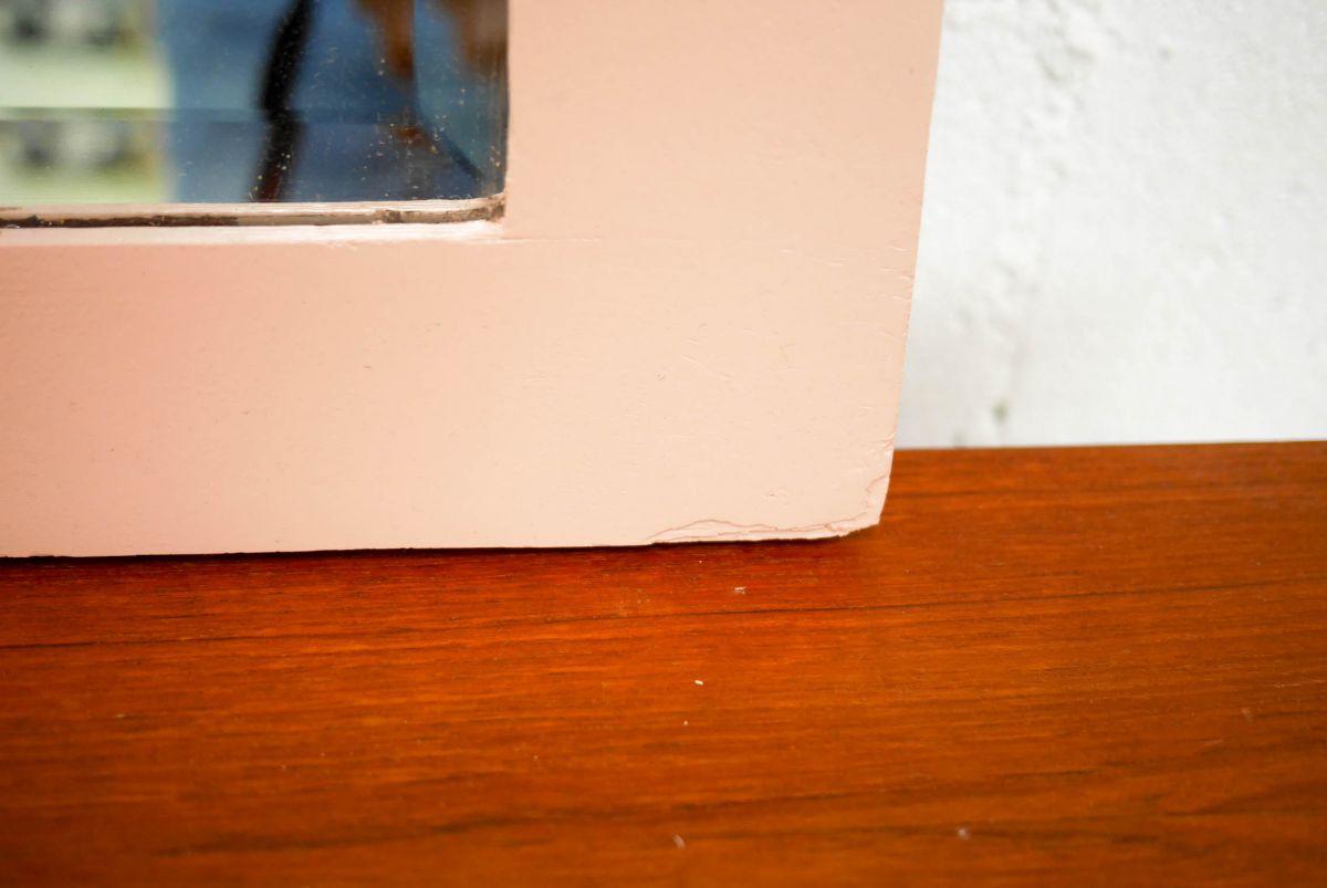 Voici un joli miroir art-déco, rénové en rose nude, avec son joli diadème fleuri ! Le bois comporte de très nombreuses irrégularités et la glace a de nombreuses petites rayures et traces d’usure. Son charme, lui reste intact !