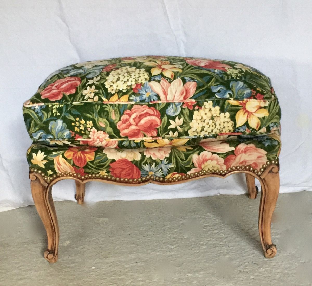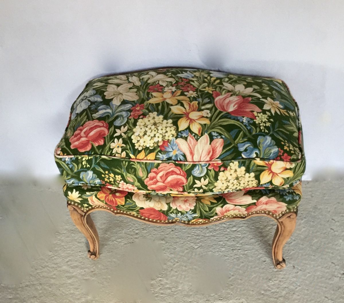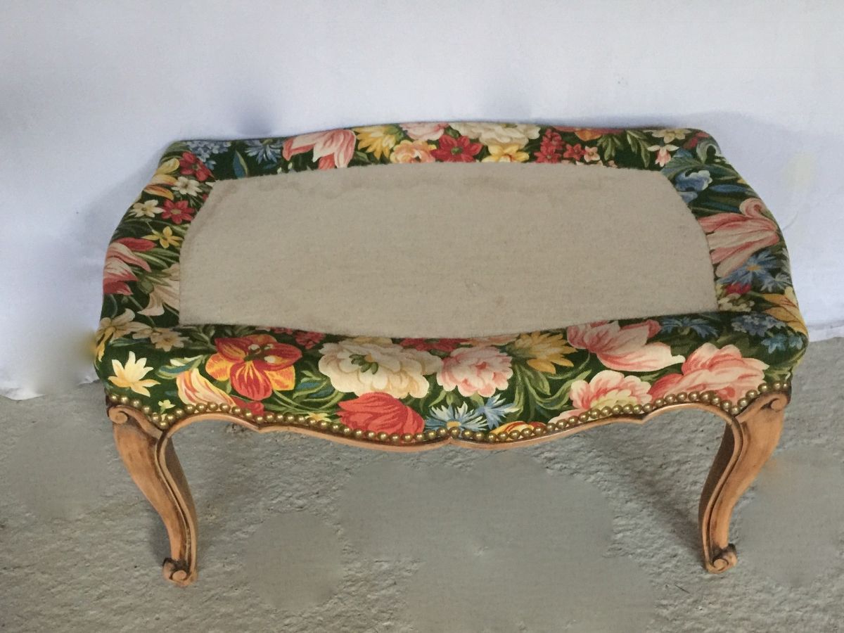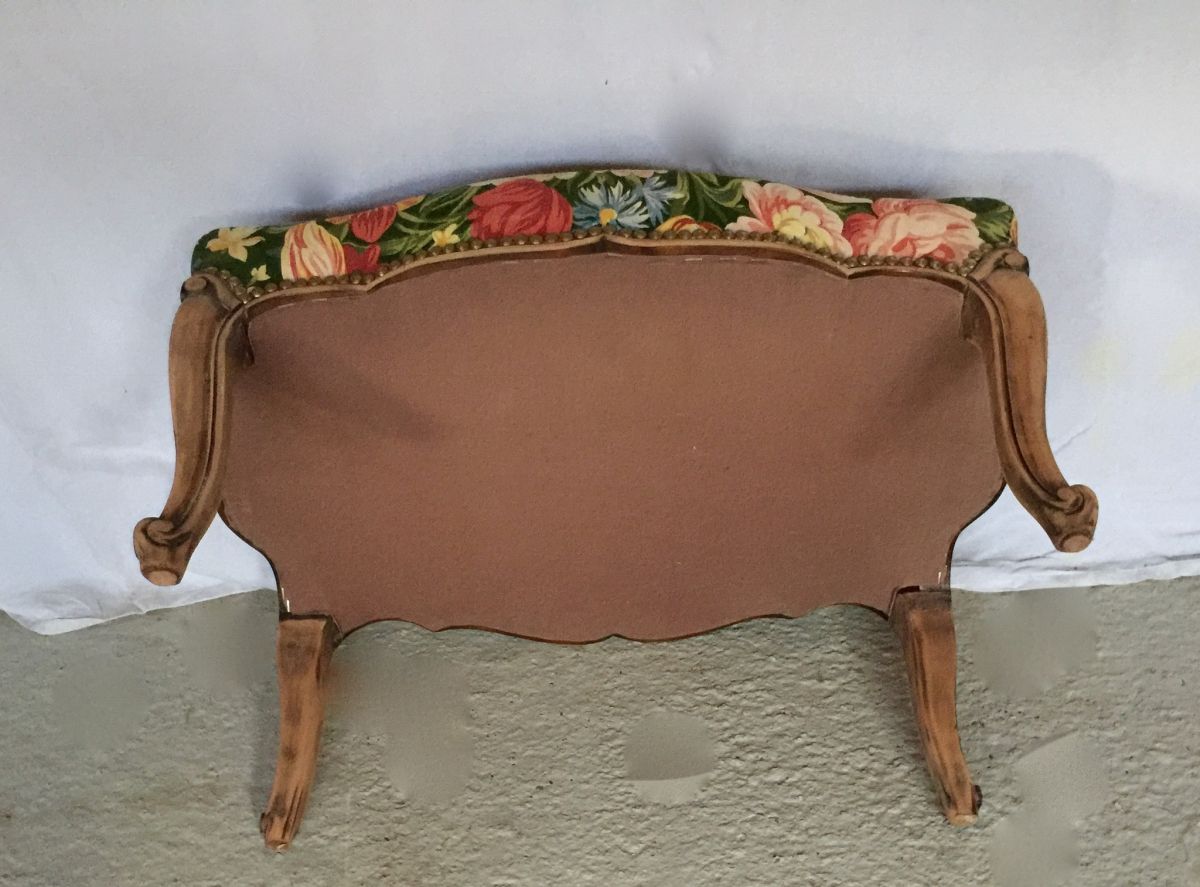 Pouf en tissu fleuri et piétement en bois décapé