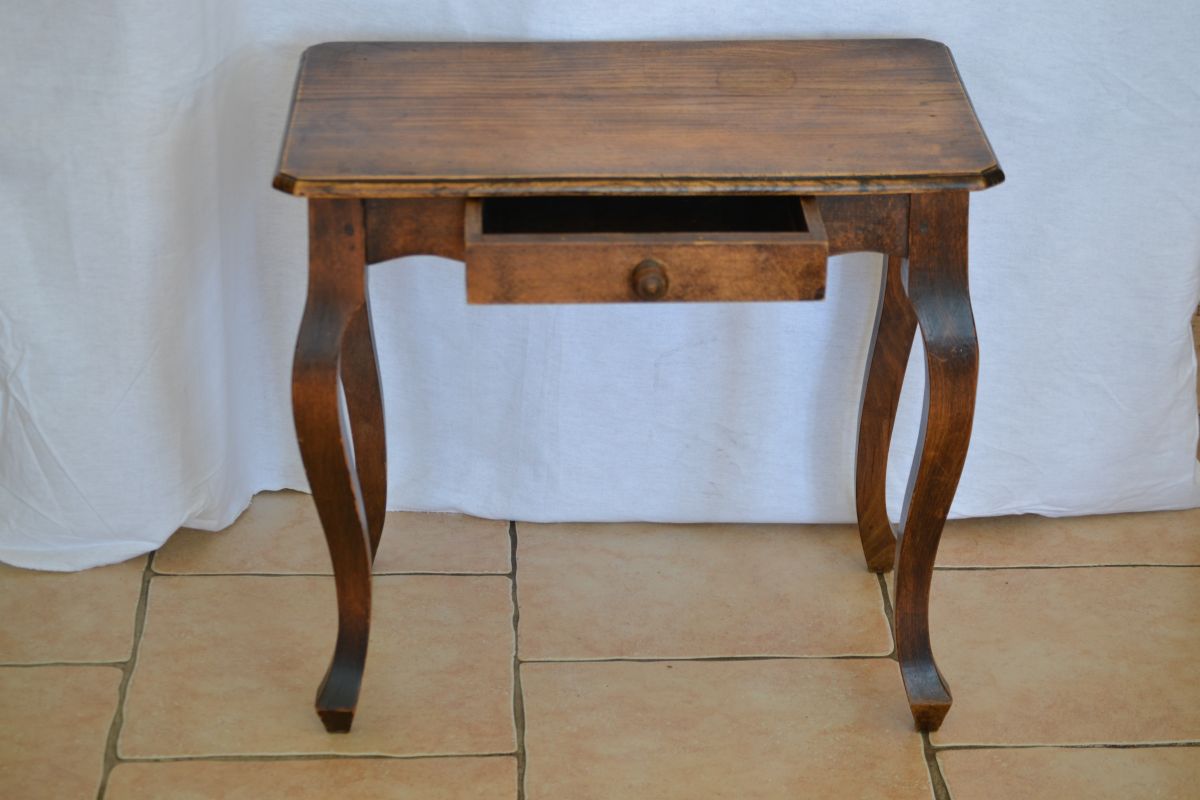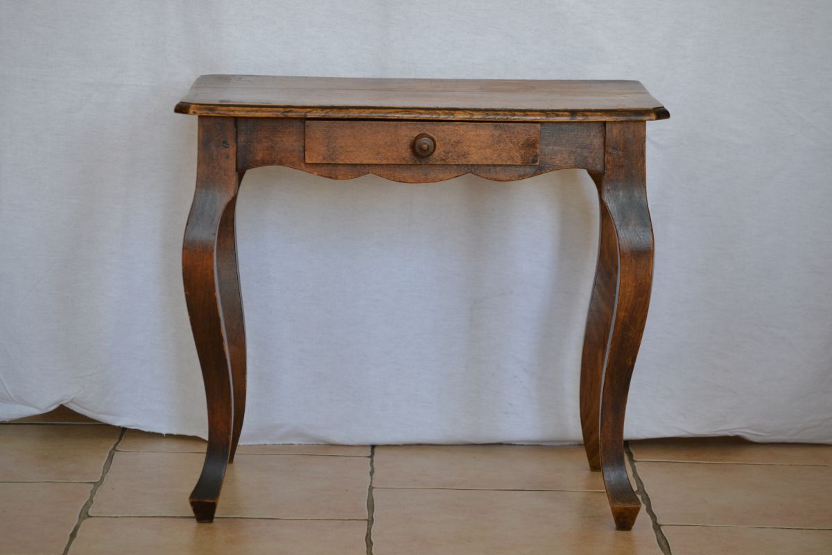 Petit bureau ou table pour enfant dans le style louis XV. Pieds galbés et tiroir en ceinture. Elégant et robuste à la fois, il saura supporter les affres des stylos, de la pâte à modeler mais aussi supporter les cahiers de coloriages et d'écriture. Son tiroir pourra garder précieusement les plus beaux crayons. Bon état, ce petit bureau peut rester sans problème tel qu'il est ou alors être relooké selon vos envies. Nous vous conseillons de l'associer avec son fauteuil paillé (Ref 15202), qui en fera un bel ensemble de style.