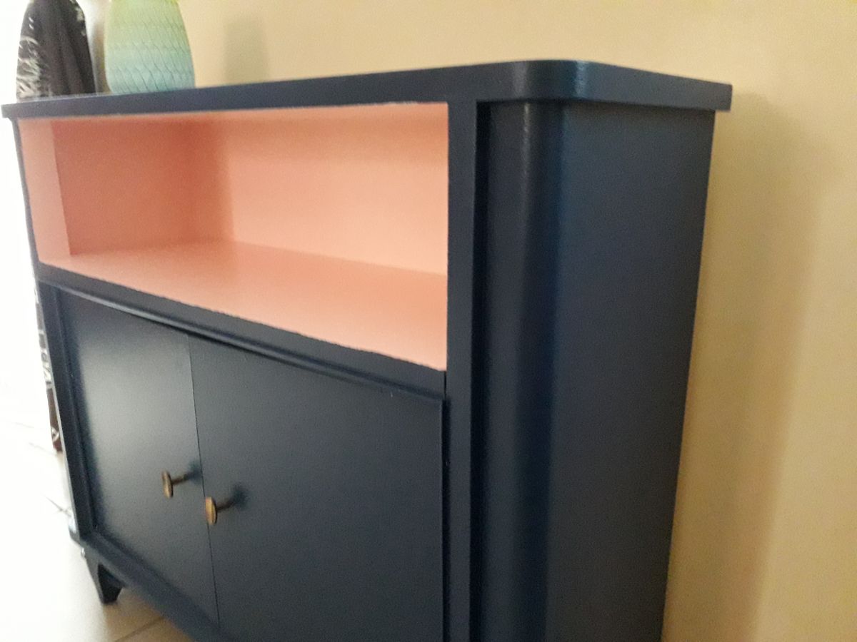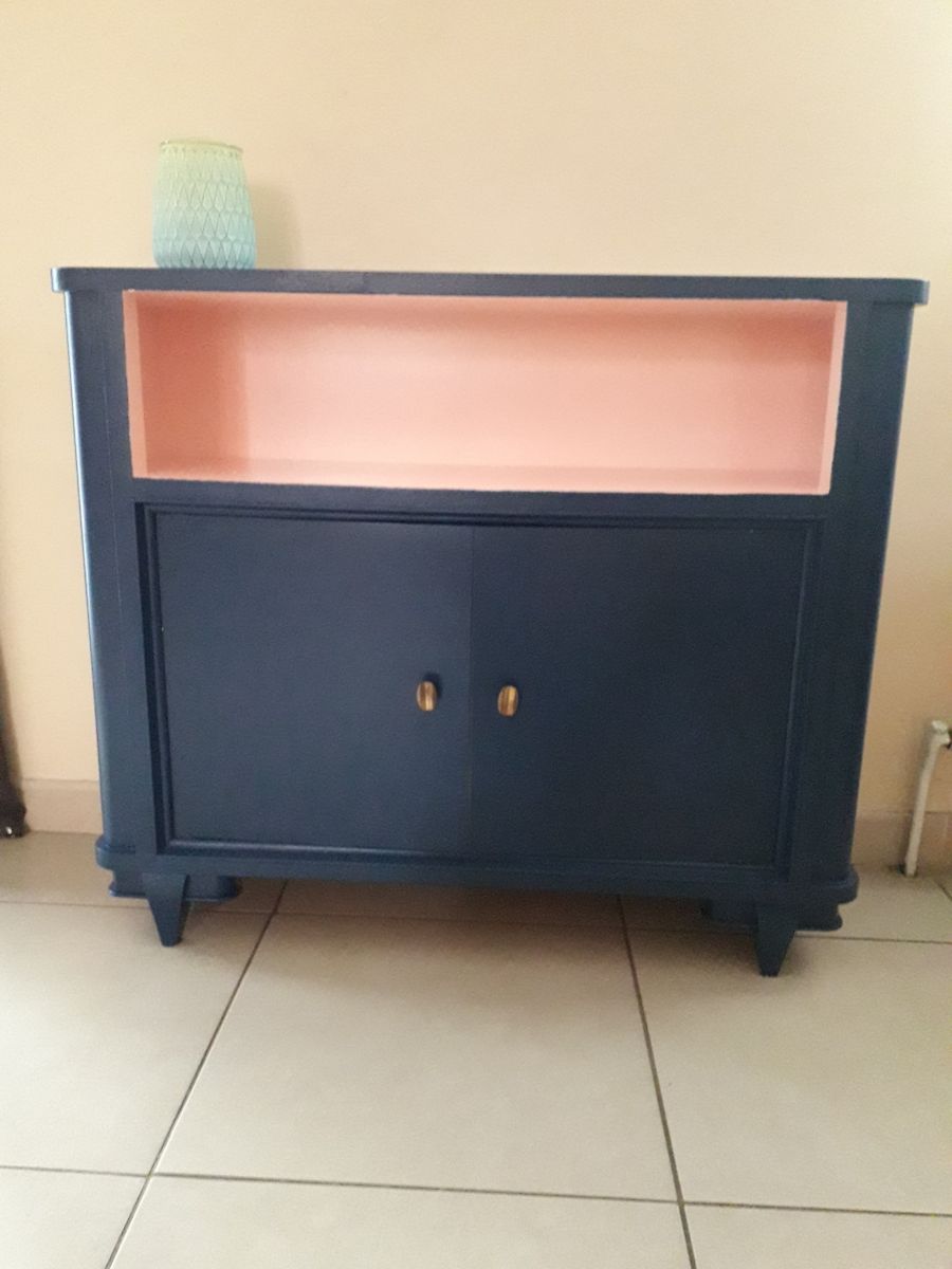 Vend joli meuble vintage relooké dans les tons bleus et rose. Il trouvera sa place dans votre intérieur, dans l'entrée ou dans une chambre d'enfant.