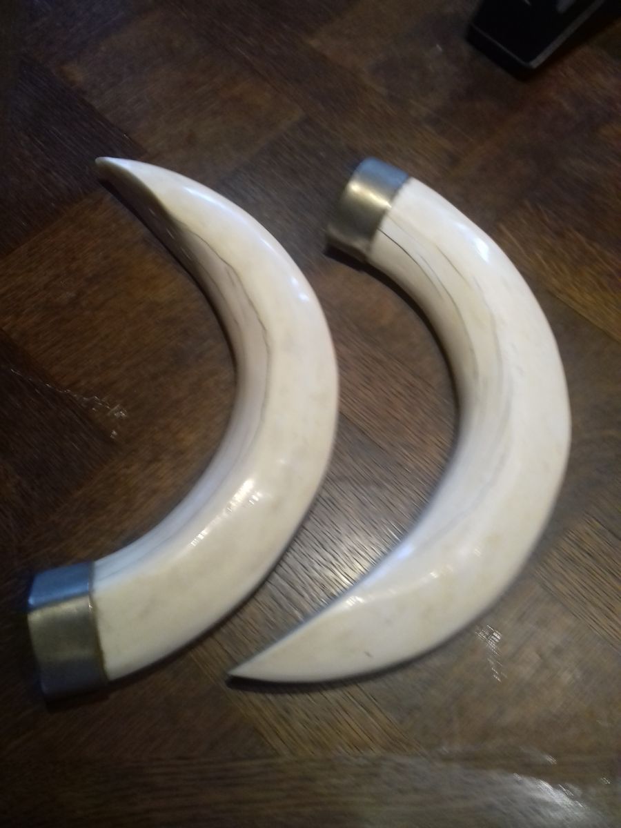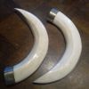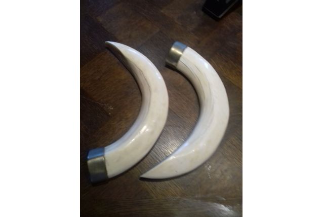 Défenses de phacochère achetées dans les années 80 au Kenya et reçues en cadeau.Serties métal, polies et vernies. Dimensions 32x5x4 env.