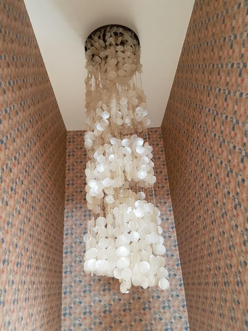 Magnifique lustre avec pampilles en nacre. Très bon état.