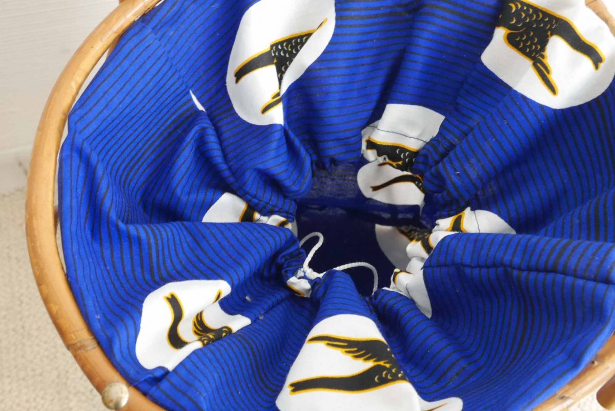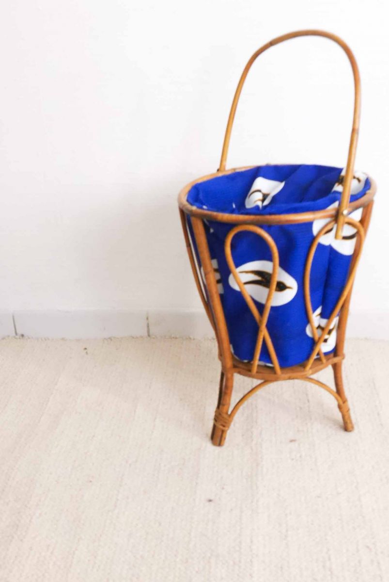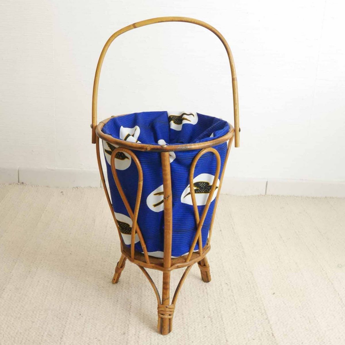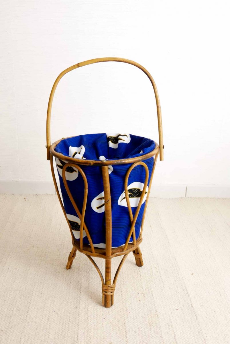 Voici une jolie boite à ouvrage de couturière / travailleuse en rotin, réhaussée par un tissu wax aux motifs hirondelles.