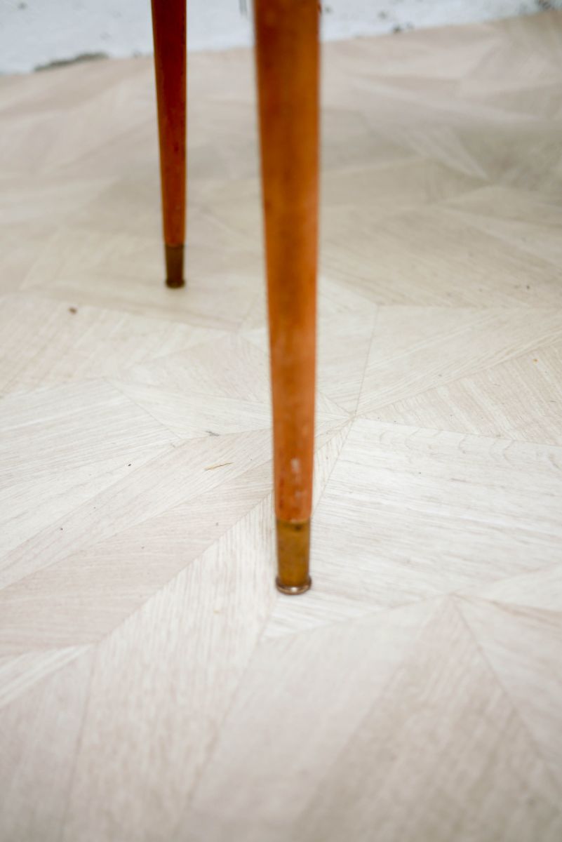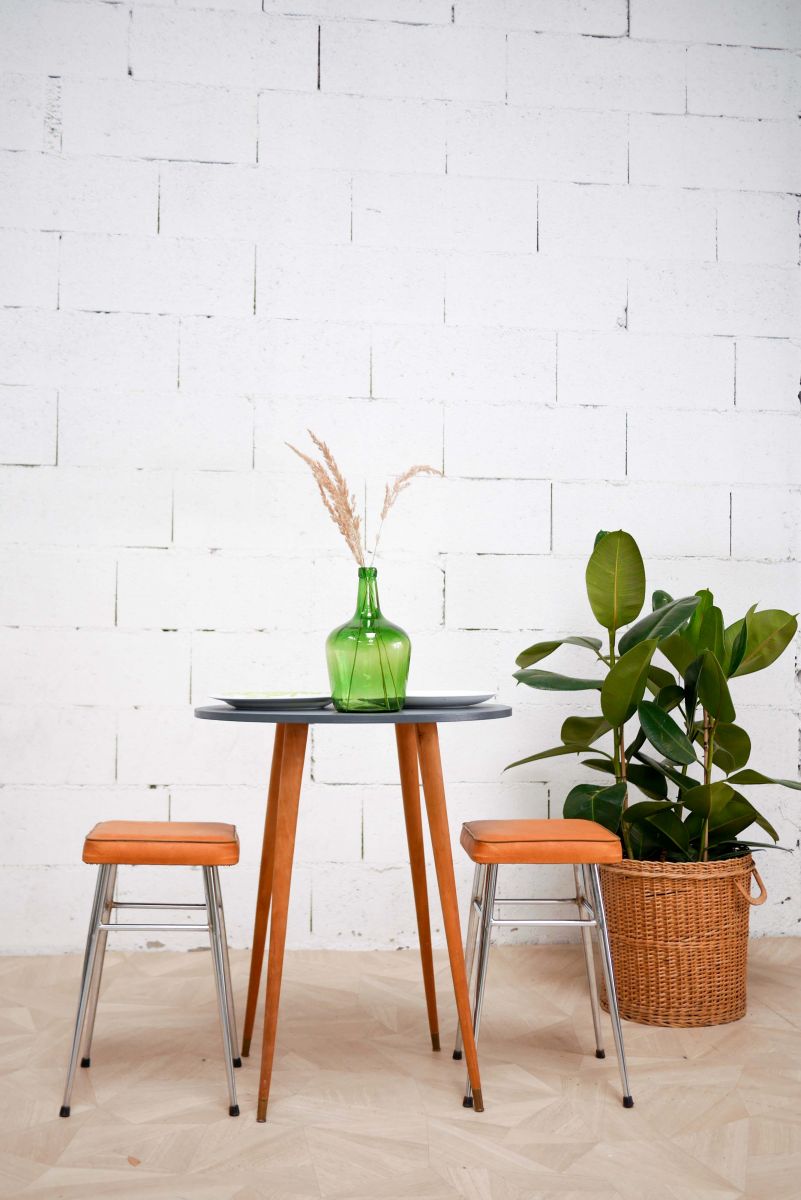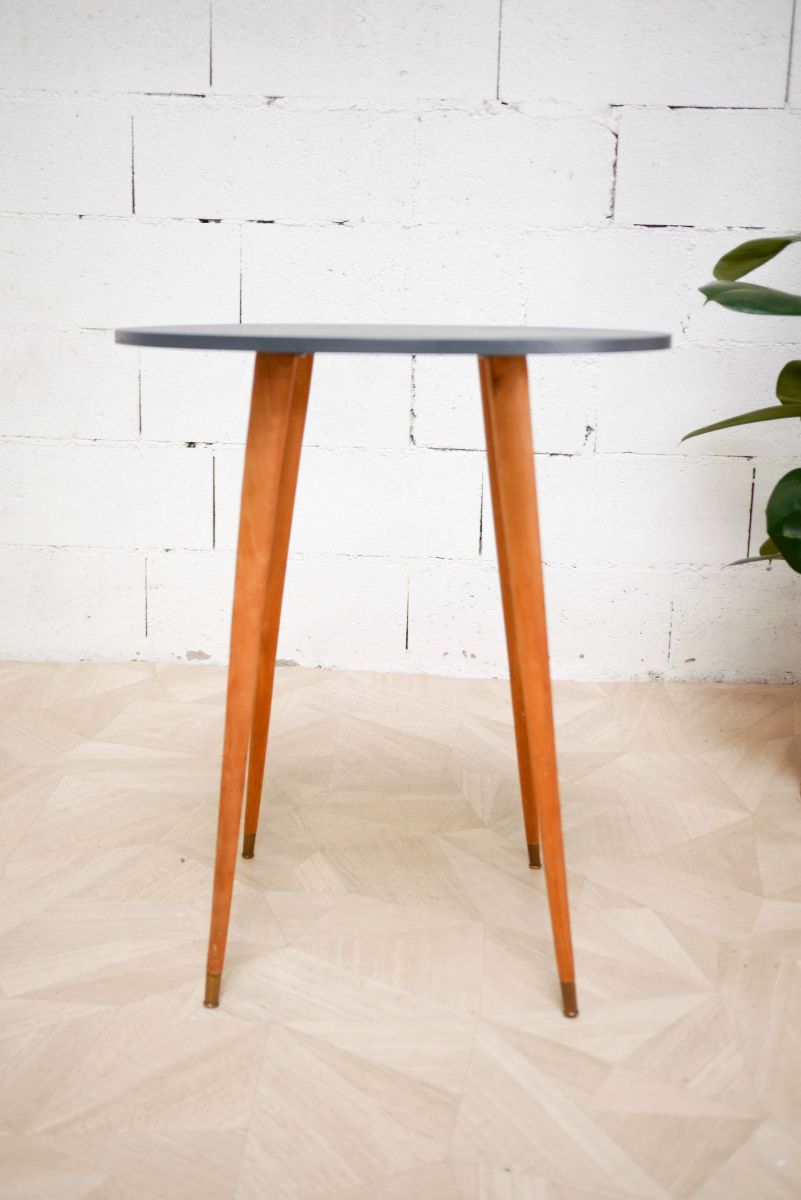 C’est une jolie table vintage, dont le plateau est rénové en gros (Rome du nuancier Chromatic) ! Les nervures du bois restent apparentes. Idéale pour une, ou deux personnes maximum. Les pieds sont dans leur jus, en bois clair et apportent un très chouette contraste. Le bout est en laiton doré. Pratiques, ils se dévissent pour le transport.