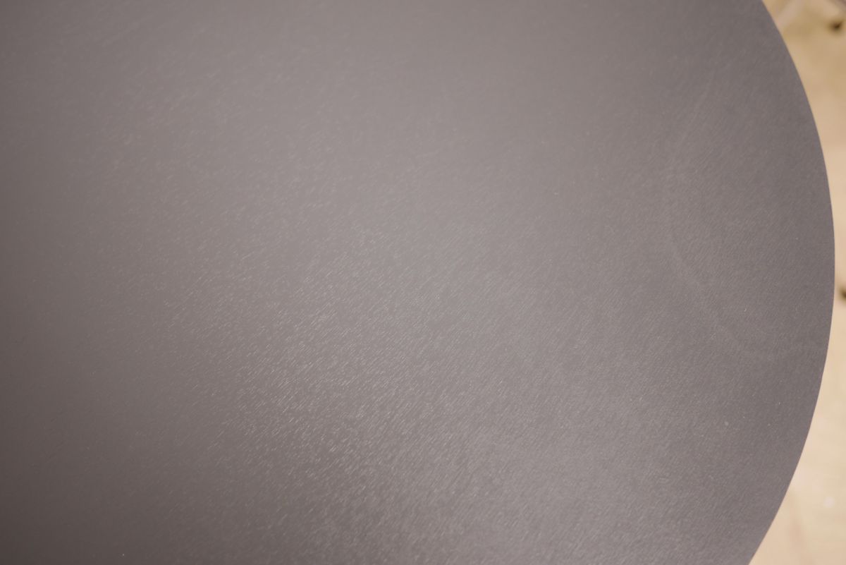 Elle est ancienne, quelques rayures et irrégularités subsistent sur le plateau, ainsi que sur les pieds.