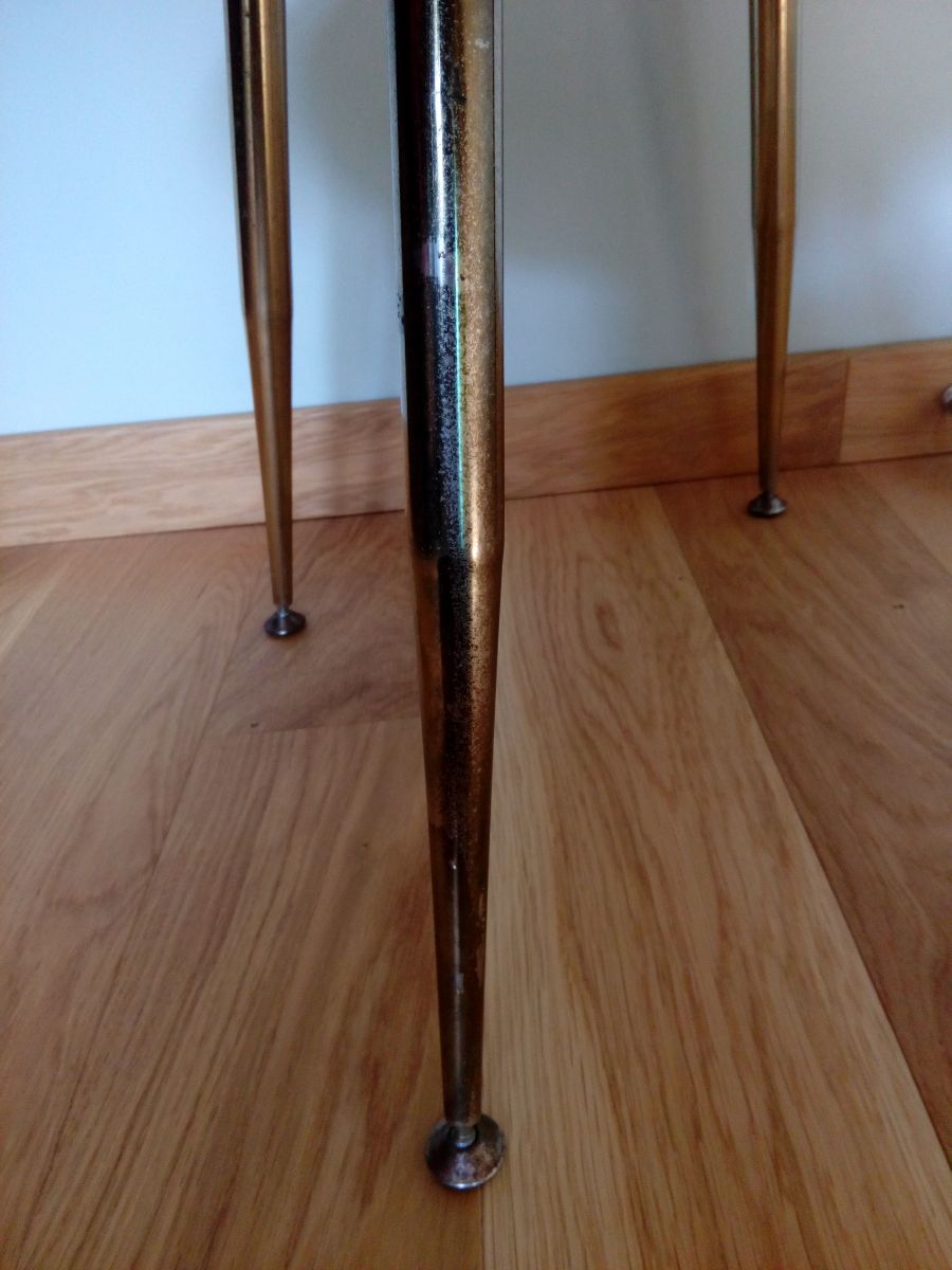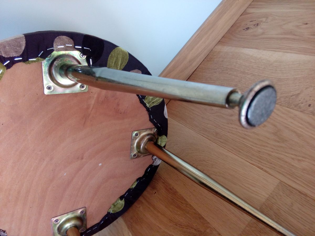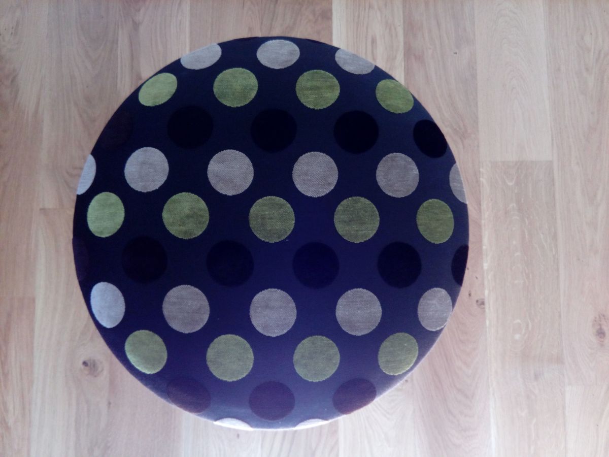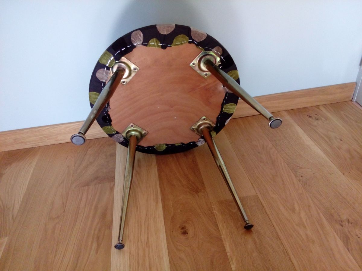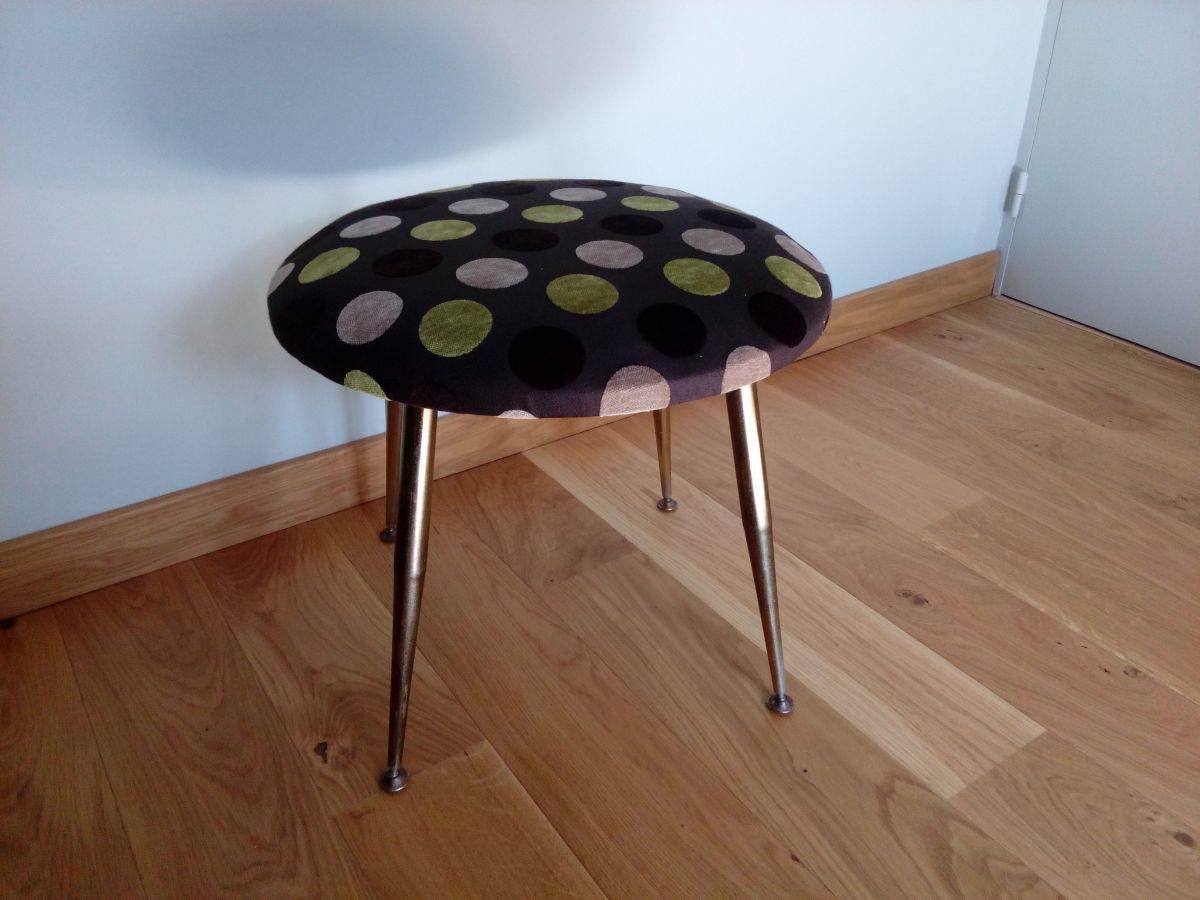 Il faut sauver le tabouret moumoute !! Oui oui ce joli tabouret était bien un tabouret moumoute, mais sa fourrure rouge flamboyante était irrécupérable!! Mais il est si charmant avec ses 4 pieds dorés à petits patins en métal, fixés sur des « rotules », que j'ai décidé de lui donner une vie de plus : après avoir réparé quelques manques sur le « plateau » en bois, j'ai remplacé la « moumoute » par un tissu d'ameublement neuf, à grands pois de couleur verte, beige ou marron foncé sur fond brun plus clair. J'ai ajouté une épaisseur de mousse de garnissage pour lui donner une forme légèrement bombée. Le tissu est agrafé, du mieux possible, mais je ne suis pas tapissière : c'est solide, mais pas très régulier en sous-face! Les patins sont pictés de rouille superficielle, quelques trace aussi sur les pieds qui ont perdu de leur brillant, de leur dorure et sont largement rayés par endroit. L'assise mesure 48 cm environ de diamètre, la hauteur en sous face de l'assise est de 35 cm, et avec le rembourrage on arrive à 42 cm de hauteur environ. Il pèse environ 3,6 kg.
