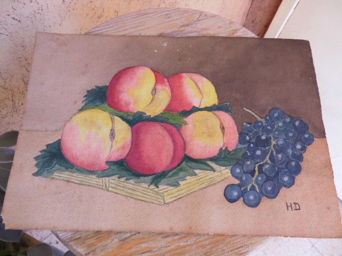 Peinture fais main de coupe de fruits datant dans les années 1930. Coté gauche abimé.