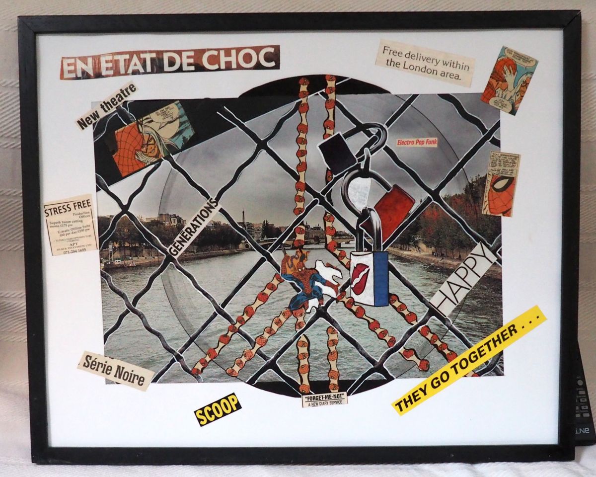 Voici une photo du pont des arts vers 2007 avec un des premiers cadna , des collages venant de divers journaux des années50 d’Angleterre des bd de marvel et des une journaux de novembre 2015 . Tirage et collage unique .