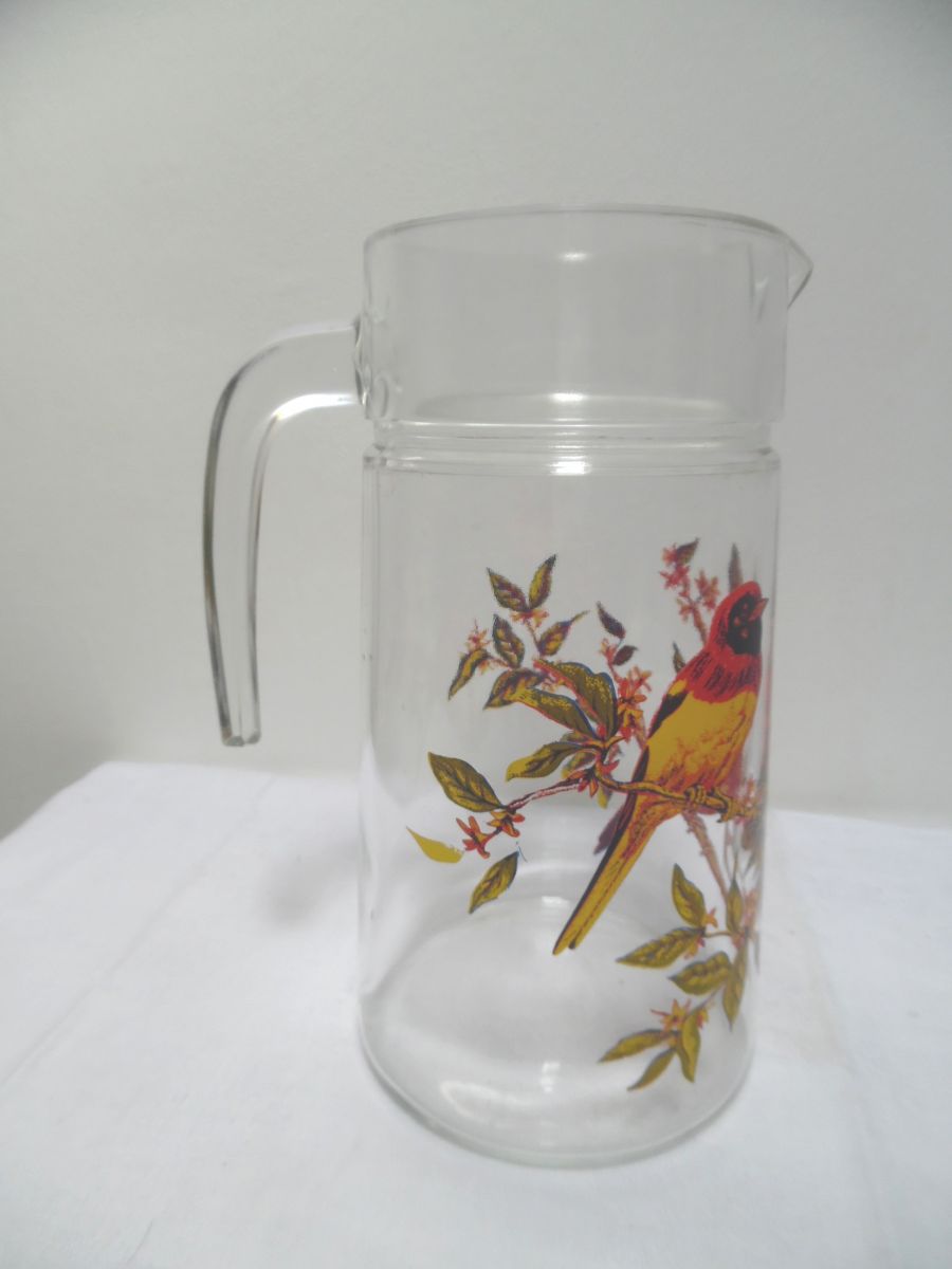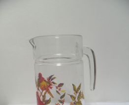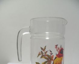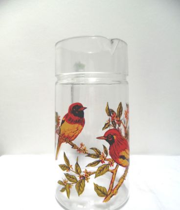 joli pichet en verre, année 70 ,sur le thème des oiseaux,de quoi égayer vos tables