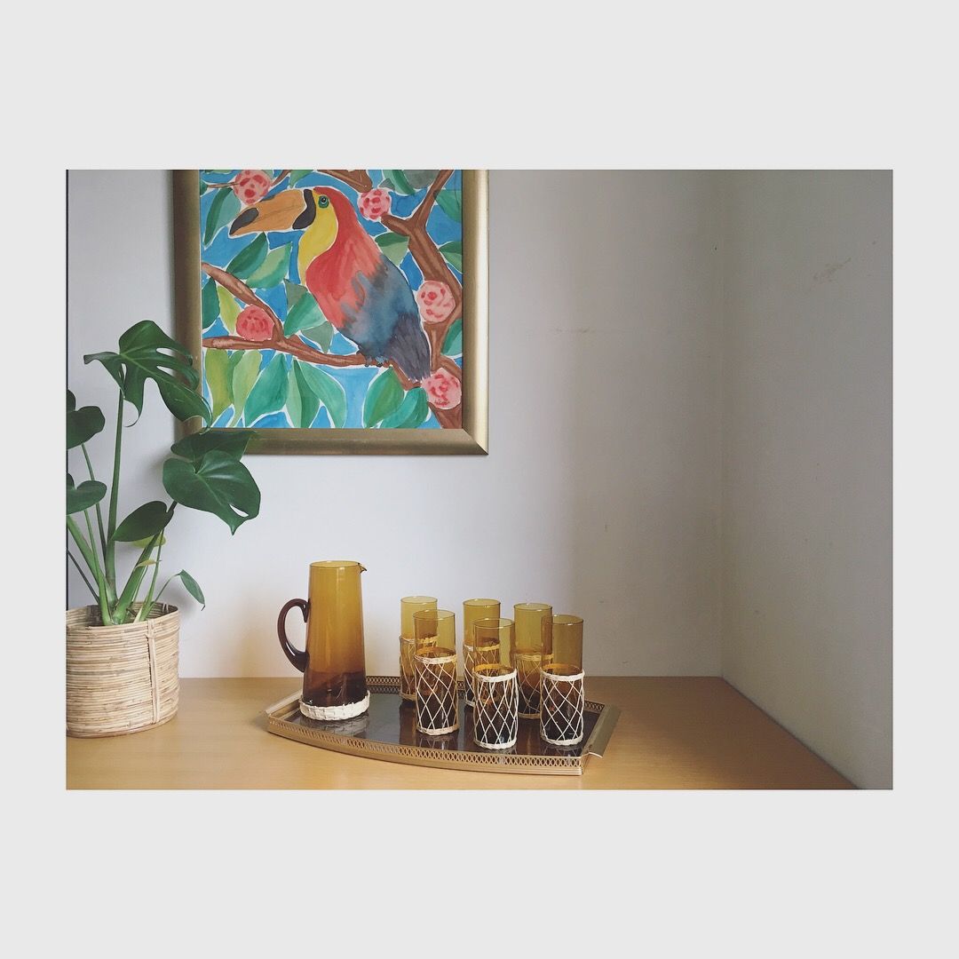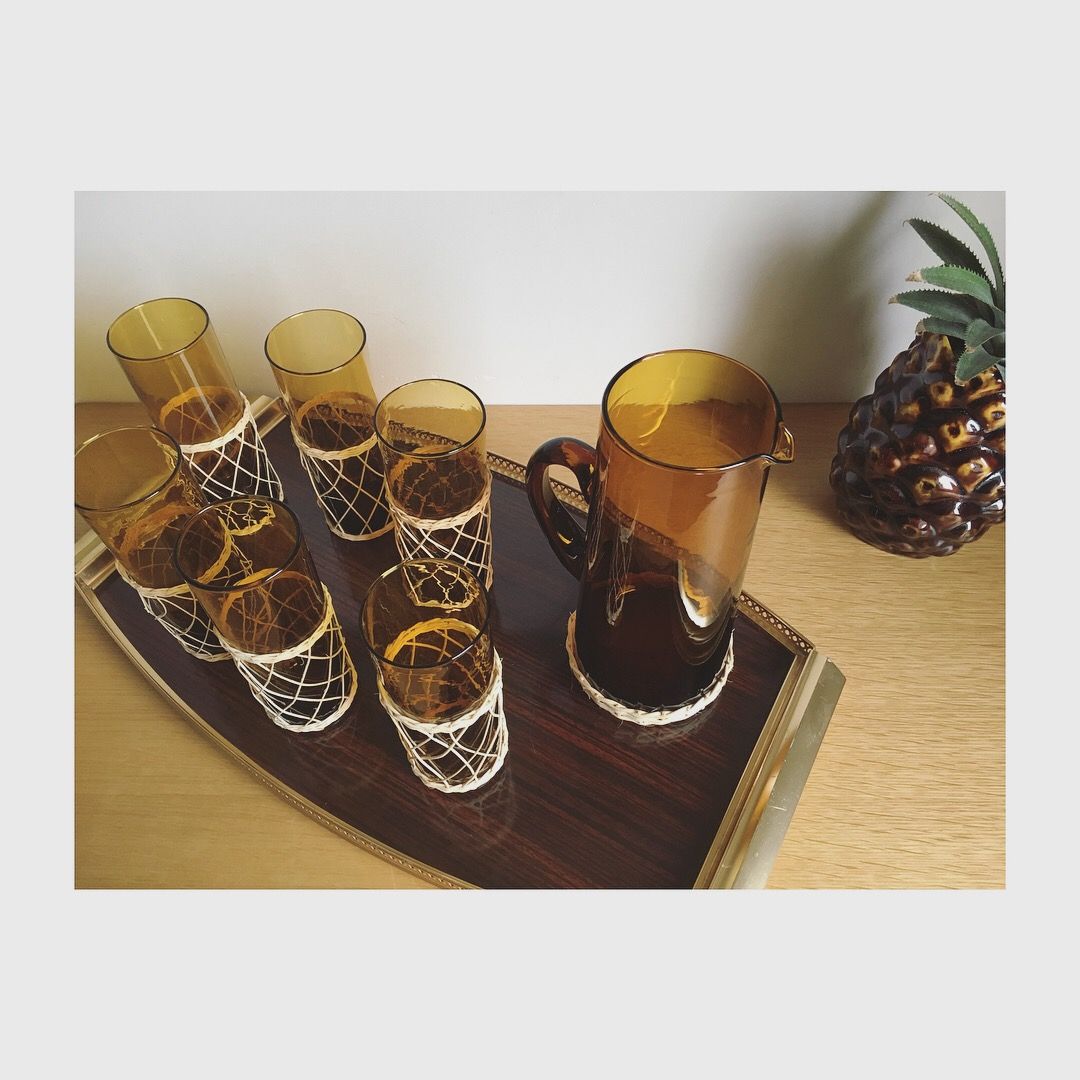 Ce service à orangeade en verre soufflé d'une belle couleur ambrée et ganté d'un délicat fil d'osier, séjournera avec élégance et simplicité aussi bien sur nos tables d'hiver que d'été.