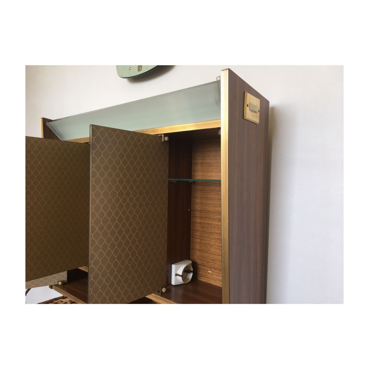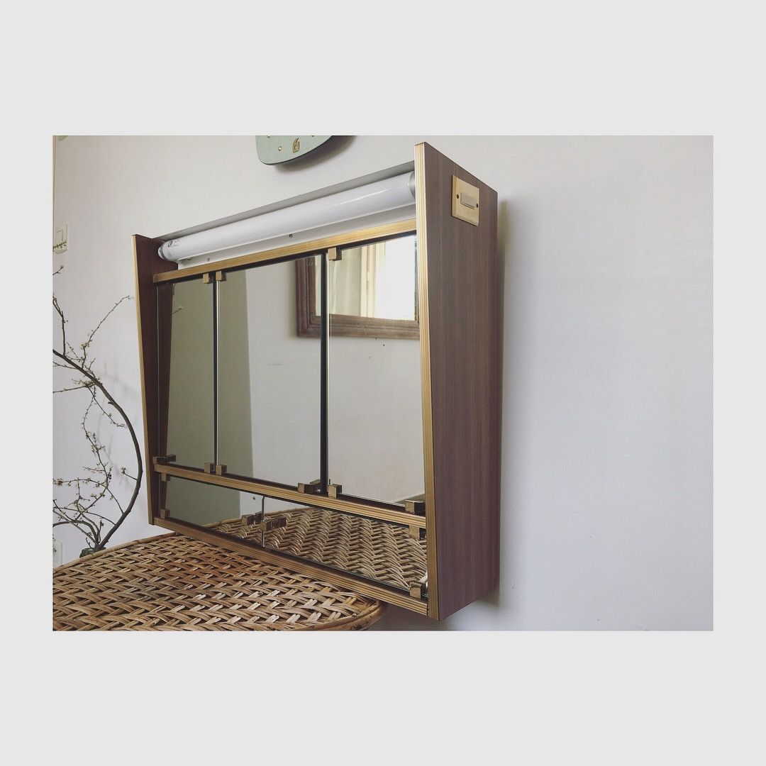 En état esthétique quasi irréprochable (elle n'a que quelques traces d'usure à l'intérieur, les miroirs sont un peu piqués par endroit, il lui manque une grande et 2 petites clayettes, les supports pour maintenir la clayette du néon est cassée).