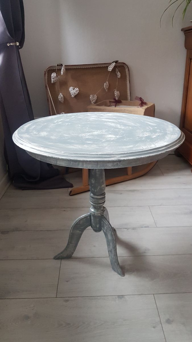 Joli petit guéridon de 59cm de haut et 59 cm de diamètre au pied tourné, joli petite mouture, en bois clair que j'ai entièrement poncé à la main, sans produits toxiques. J'ai utilisé de la peinture à base de caféine blanche pour la couche accrocheuse et pour la peinture dominante gris ardoise, idem de la peinture à base de caféine pour une finition en utilisant la technique du chaulé qui fait ressortir le joli côté vintage de ce guéridon. Un vernis vient terminer le tout.