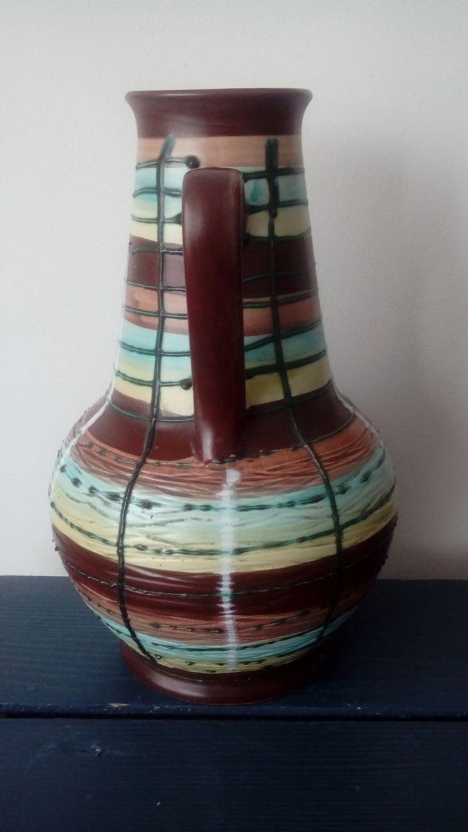 Vase en céramique GERMANY avec anse et rayures turquoise, jaune pâle, vertes et marron.