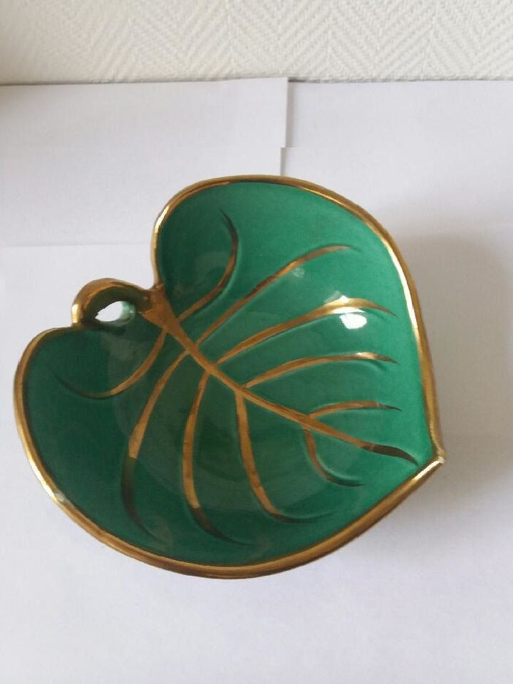 Coupelle vintage en forme de feuille avec le dessin et le liseret doré en très bon état.