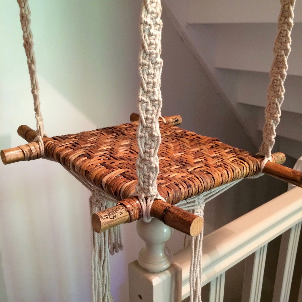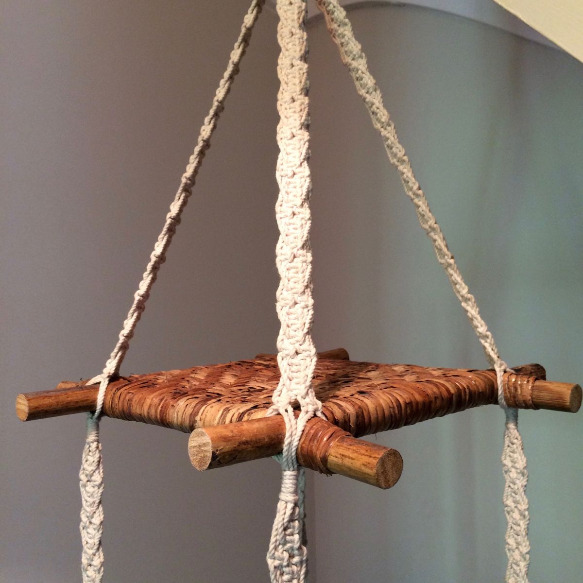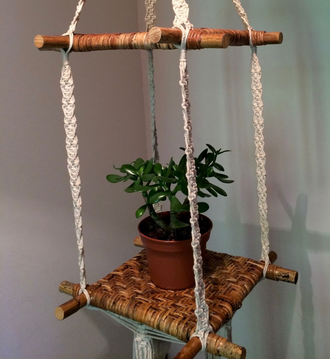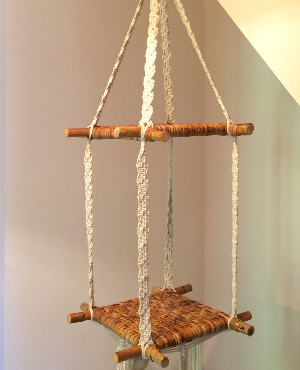 Originale suspension porte plantes vintage, avec deux tablettes cannées et un très joli travail de tissage en macramé ; Solide et stable, elle est parfaite pour présenter vos compositions végétales ou d'autres objets.
