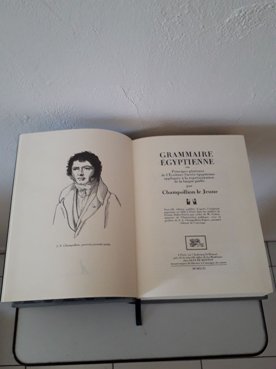 GRAMMAIRE EGYPTIENNE DE CHAMPOLLION LE JEUNE, EDITIONS DE BONNOT 1994, 555 PAGES, COUVERTURE RIGIDE IMPECCABLE, DIMENSION 21-27,5, CALLIGRAPHIES DOREES EN RELIEF ET DORE SUR TRANCHE, NUMEROTE 4800/7000 EXEMPLAIRES, TRES BON ETAT.