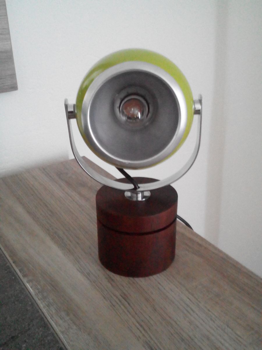 Lampe boule des années 70,bon état avec socle en bois d'origine,l'ampoule n'est pas livrée avec E14.Légère rayure mais en très bon état.