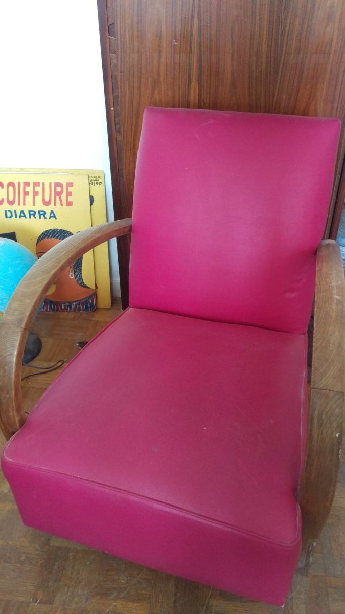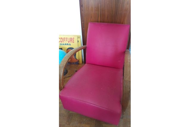 Beau fauteuil 50 refait neuf avec cuir rose bonbon. Parfait état.