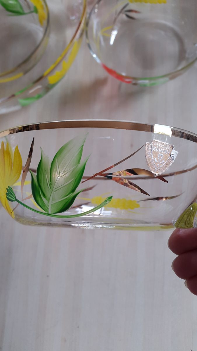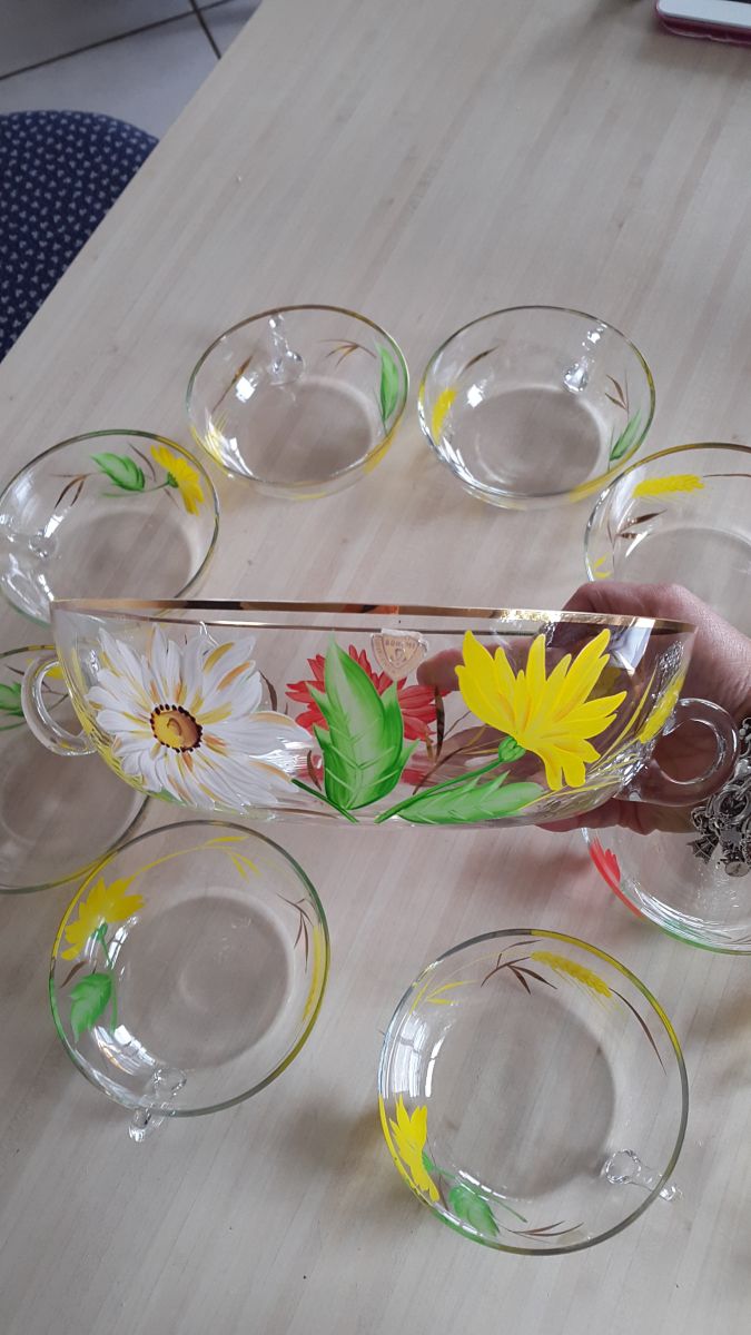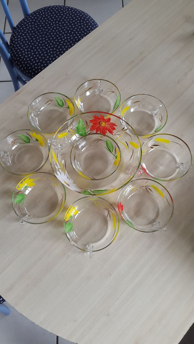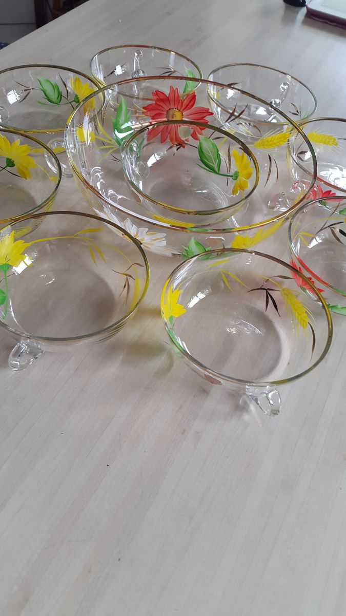 Le saladier a deux anses et chaque coupelle une anse. Chaque pièce est bordée de dorure