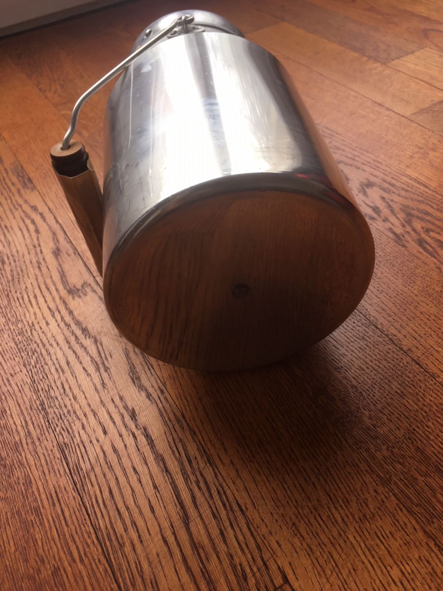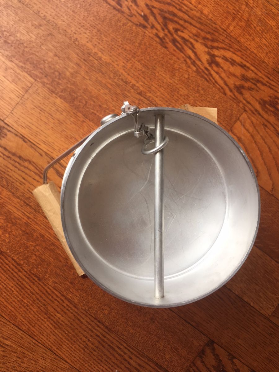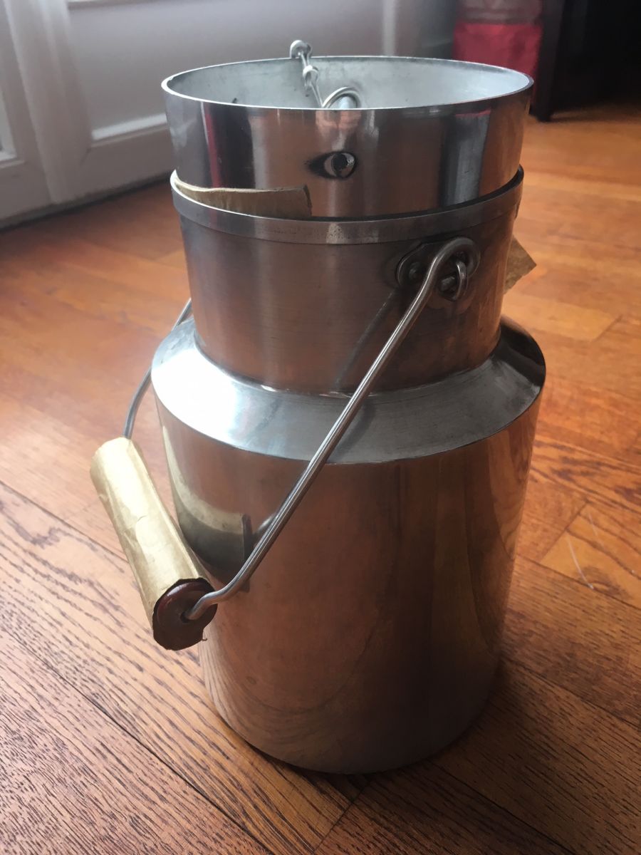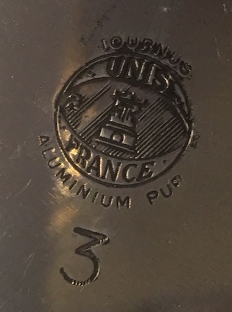 Pot à lait en aluminium avec poignée en bois et couvercle avec sa chaine. Neuf avec son emballage d'origine (provient d'une quincaillerie fermée en 1960). Inscription "Tournus Unis France 3". diamètre = 15cm. hauteur = 26 cm poids=430g