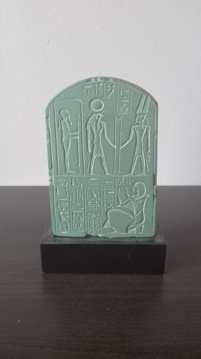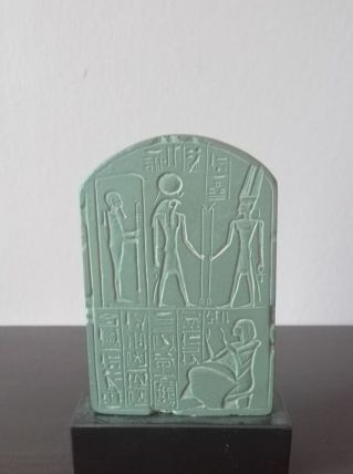 Cette stèle votive représente le précepteur de Ramsès II, agenouillé, les mains levées, adorant trois divinités: Amon, Rê Horakhty et Ptah