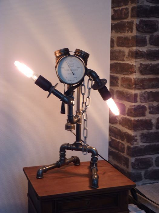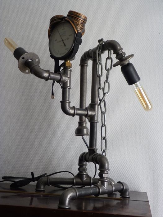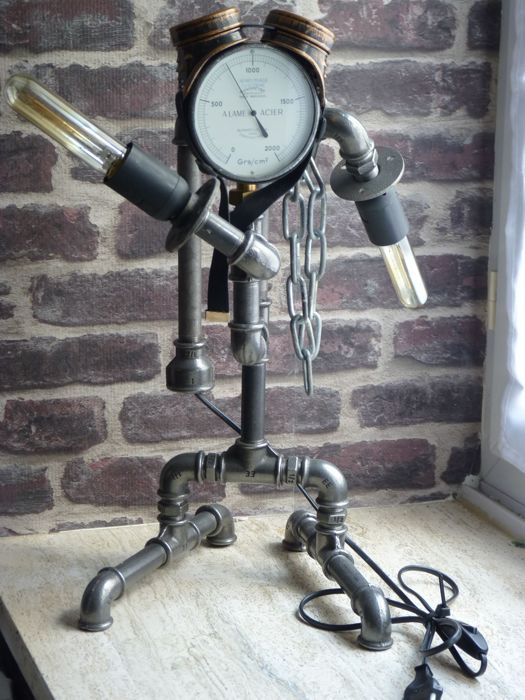 Lampe en fonte réalisée à partir d'objets de récup (plomberie...) Elle agrémentera à la perfection un intérieur loft, indus ou steampunk.