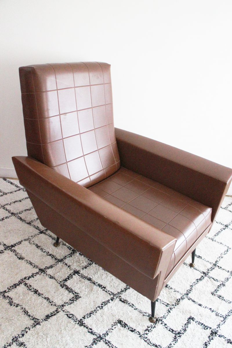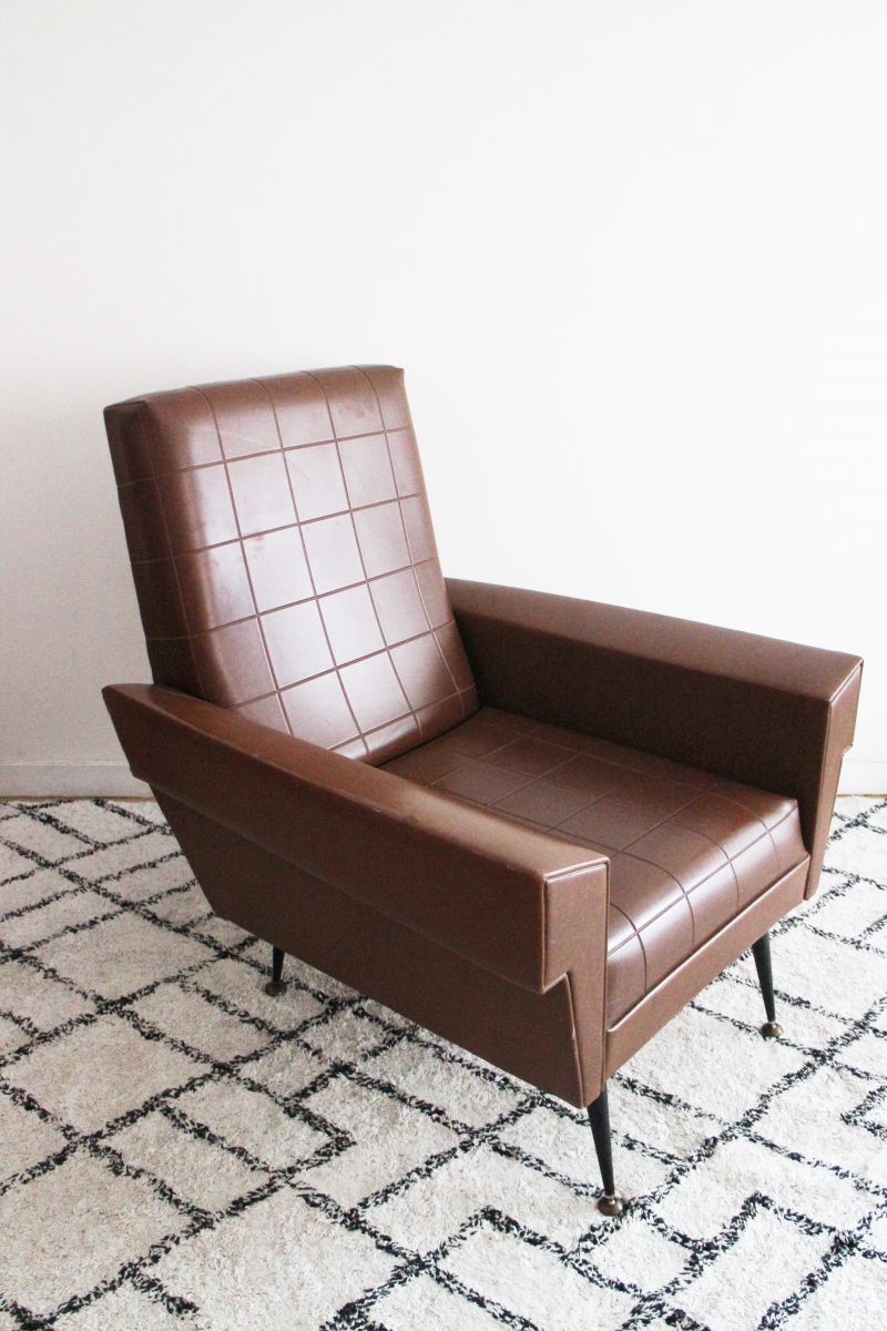 Fauteuil skaï marron pieds compas 1950's en très bon état.