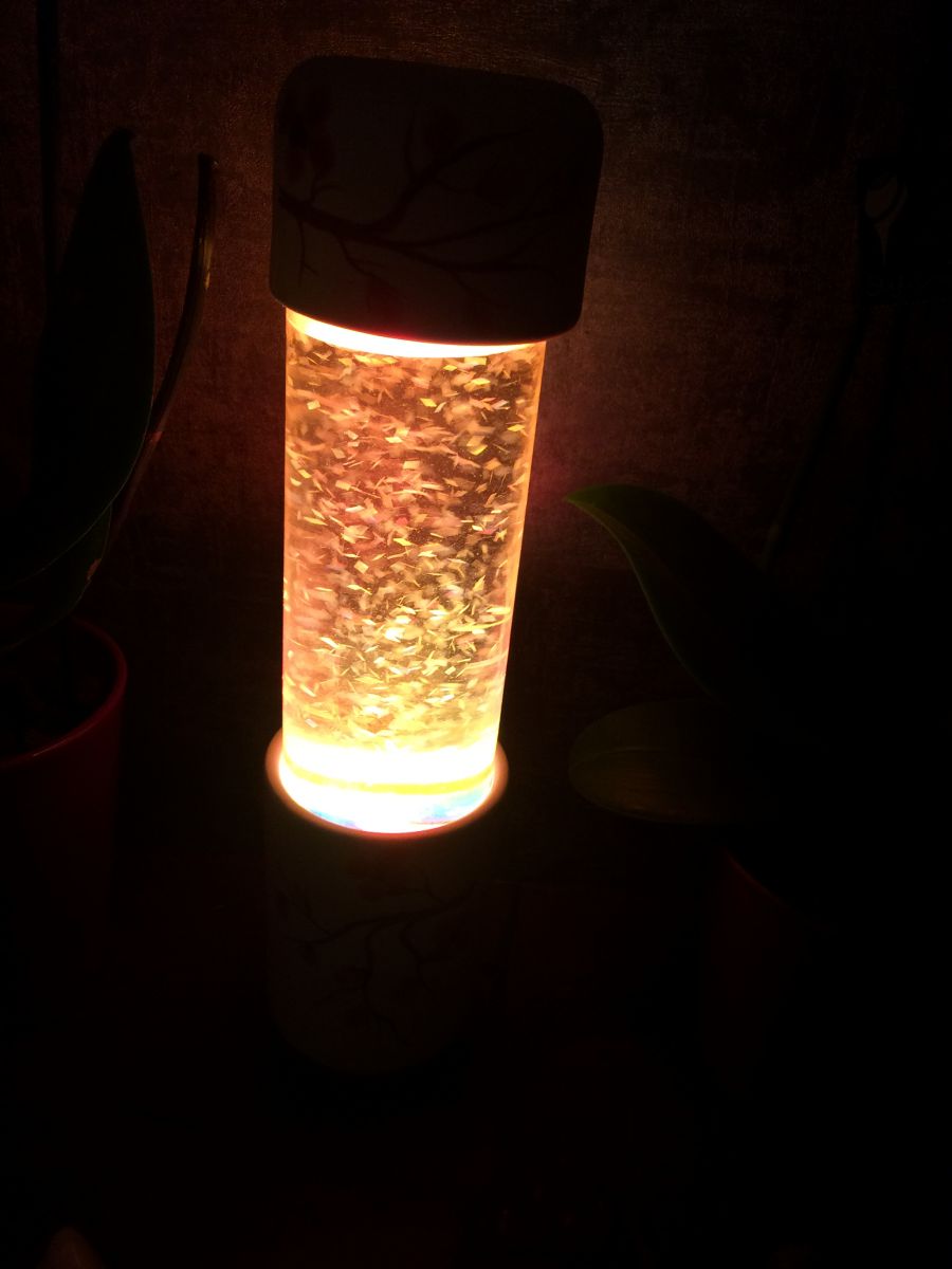 Lorsque l'ampoule chauffe les paillettes se dispersent et réfléchissent créant une douce lumière d'ambiance.