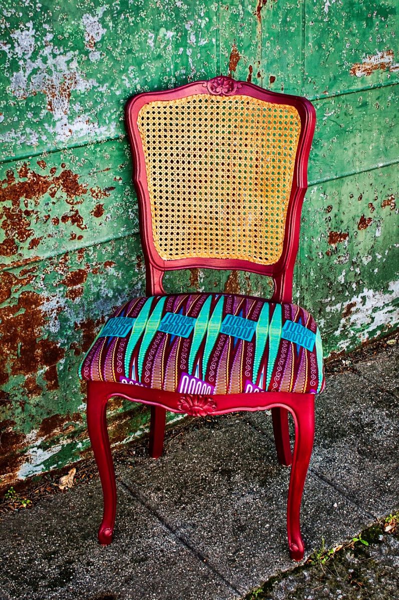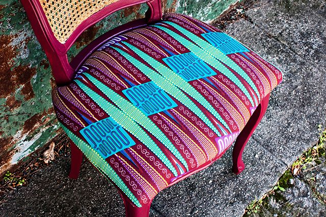 Sangle jute, mousse HR et tissu wax africain sur l'assise.