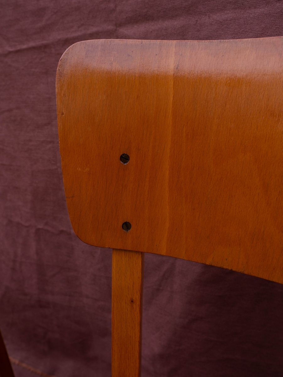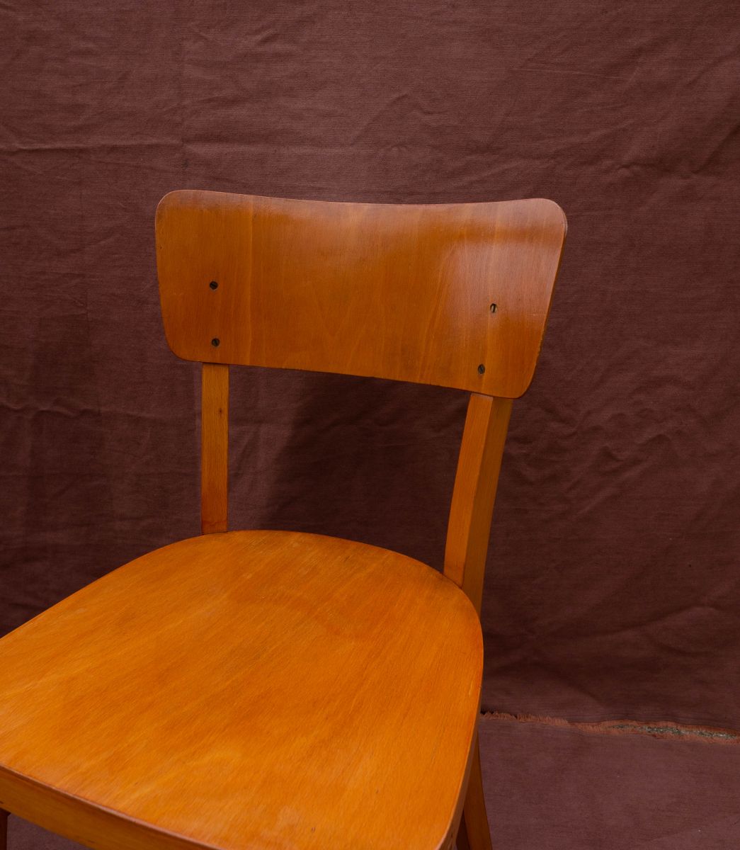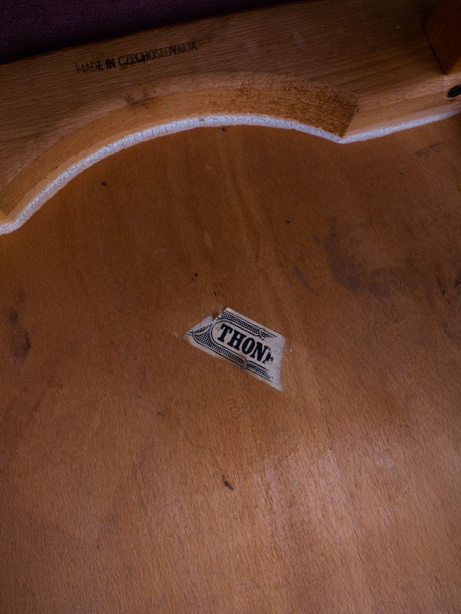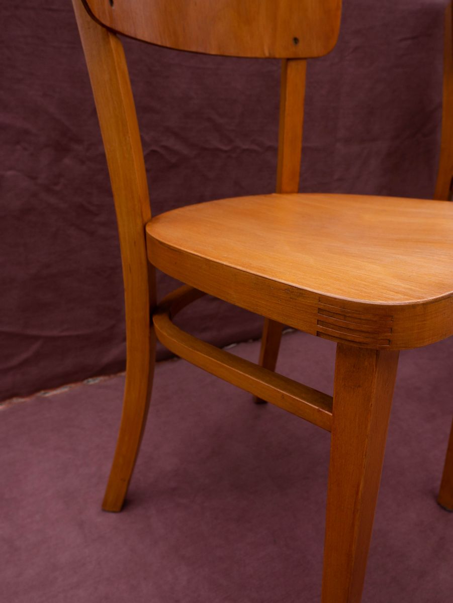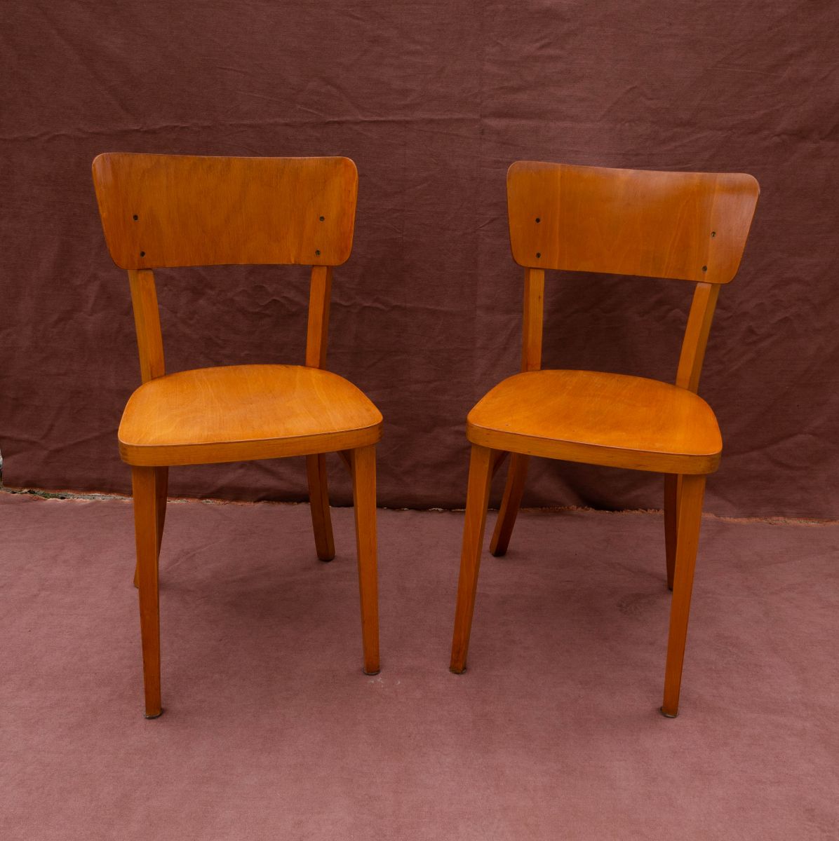 Sublime pair de chaises de la marque Thonet. Elles datent des années 50 avec pour lieu de fabrication, la Tchécoslovaquie. L'étiquette et le tampon sont toujours présents. Les deux chaises ont été entièrement revernis avec la teinte d'origine, légèrement orangée. Elles sont dans un superbe état. Une différence de couleur est présente sur un angle d'un dossier, e placage de l'angle était cassé. Il a donc été réparé et revernis. Visible sur les photos, cela reste uniforme. Elles sont solides ainsi que stables. Merveilleuse pour une décoration et une ambiance bistrot ainsi que vintage.