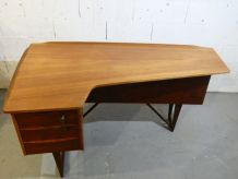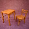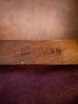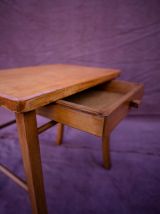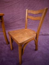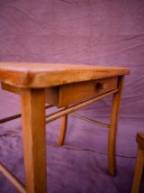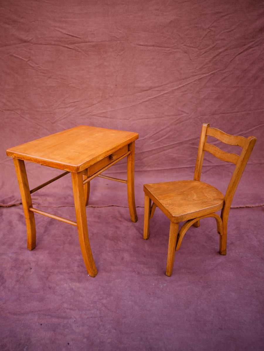 Ensemble composé d'un bureau et de sa chaise, le tout estampillé Baumann. Les deux éléments sont dans un parfait état. Ils ont été nettoyé, poncé et revernis dans leur teinte d'origine. Ce qui donne cet aspect brillant ainsi qu'éclatant à l'ensemble. Sans dénaturer la patine du bois. Le bureau est composé d'un petit tiroir qui coulisse sans dérangement. Il n'y a aucune cassure ou usure inhabituelle. Bureau : Hauteur 51,5 cm, Largeur 49 cm, Profondeur 35,5 cm. Chaise : Hauteur 54,5 cm, Assise hauteur 29 cm, Largeur 35,5 cm, Profondeur 34 cm.