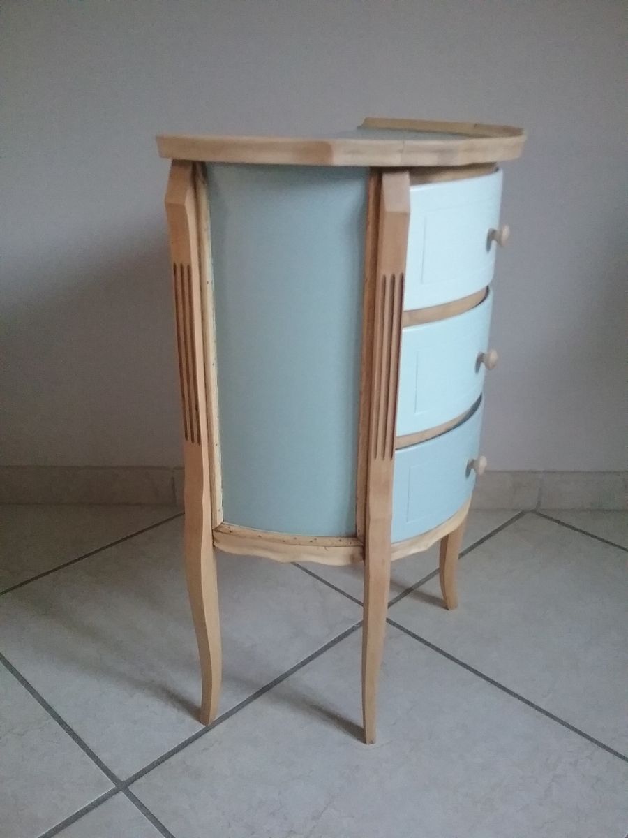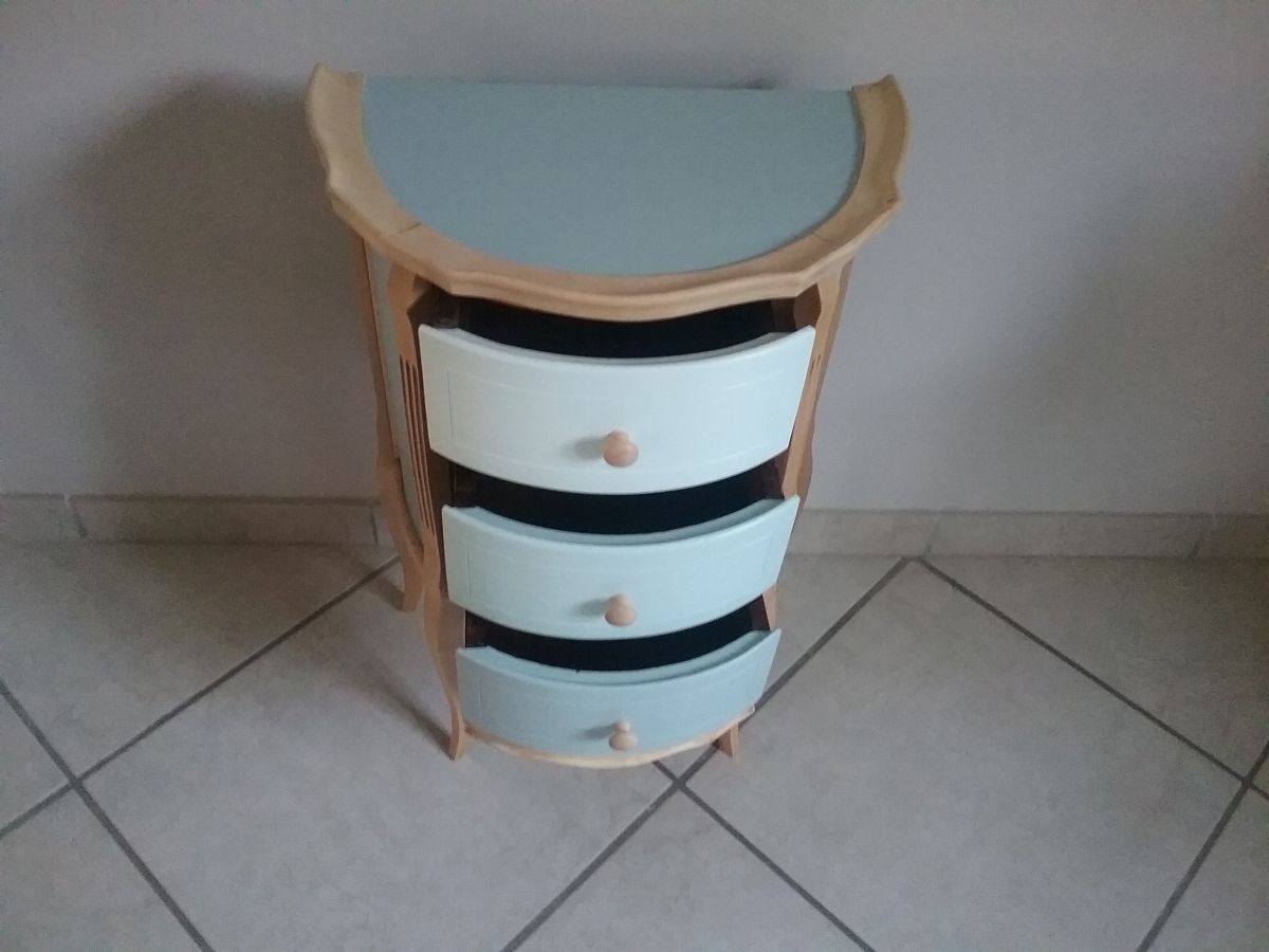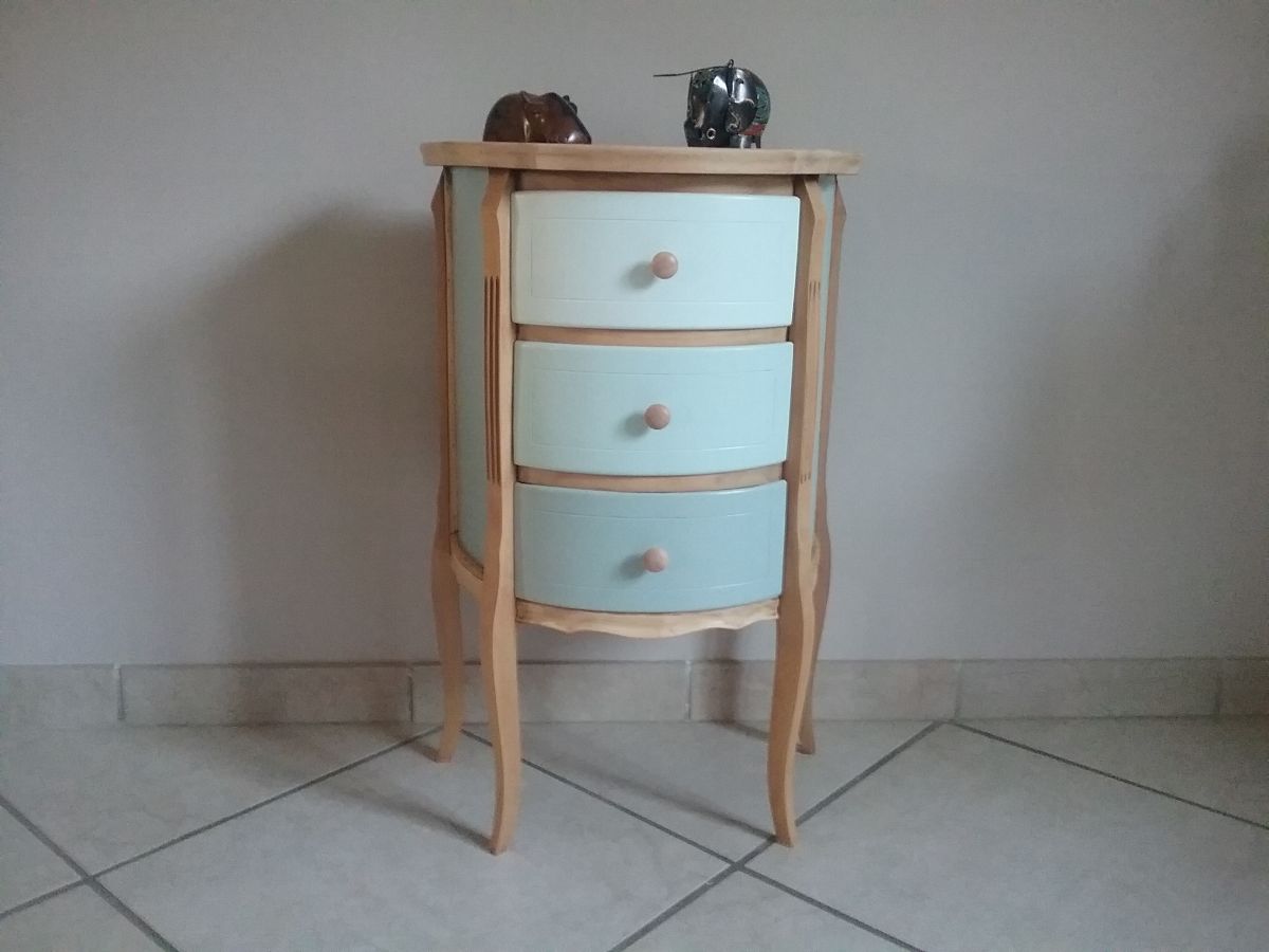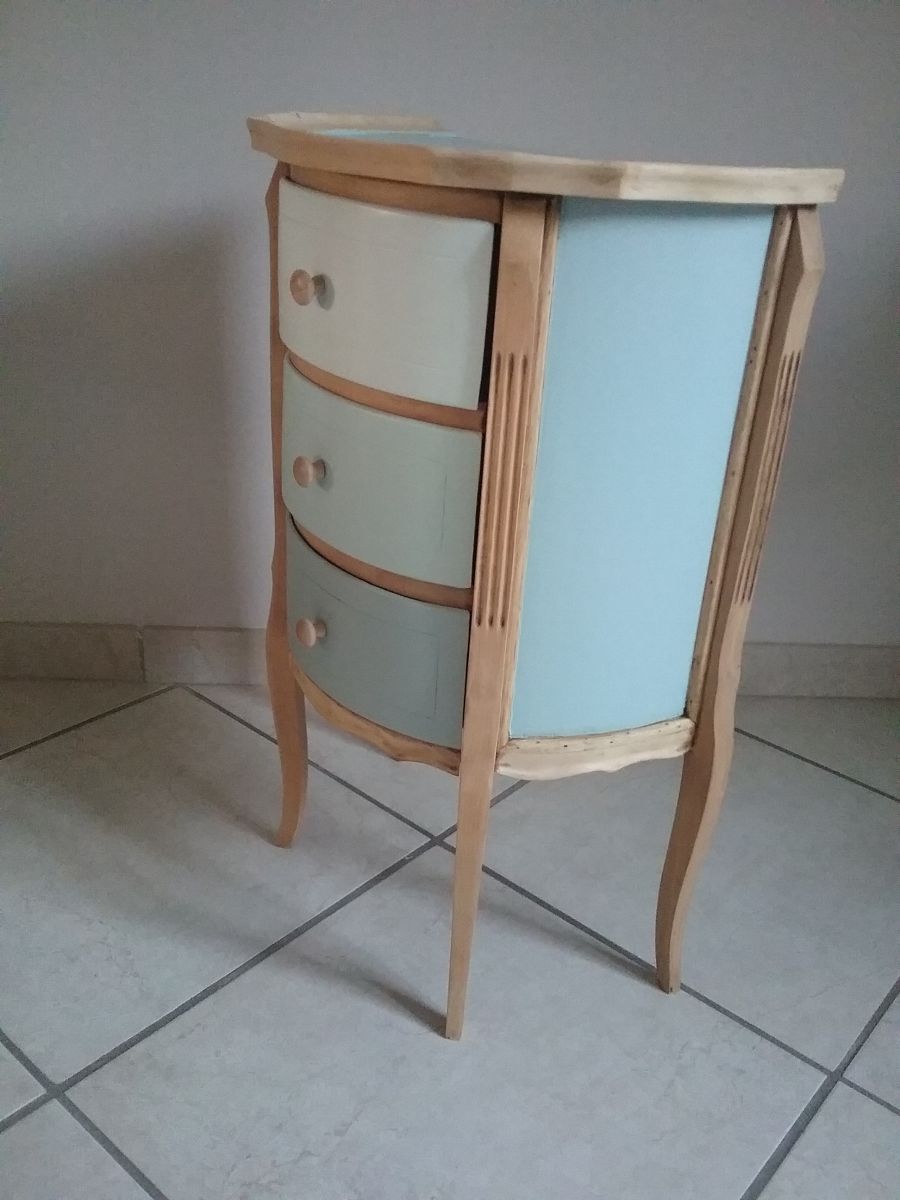 Très joli petit meuble ancien de forme arrondie entièrement rénové et repeint de différentes couleurs.