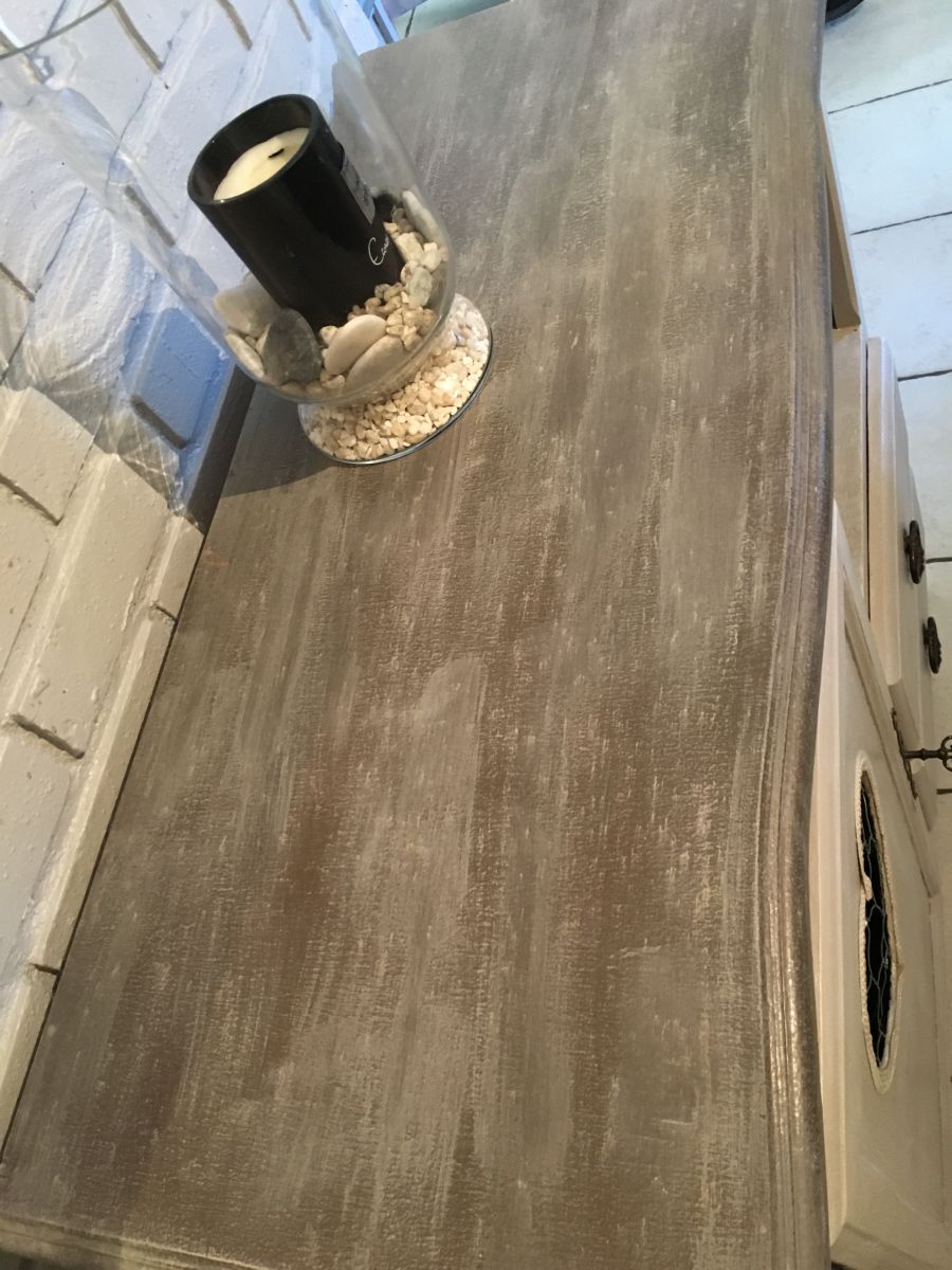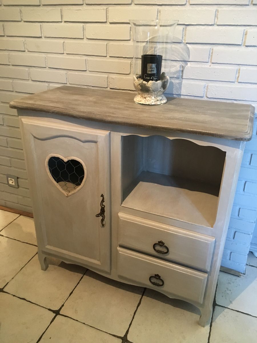 MEUBLE ANCIEN EN BOIS MASSIF . Entièrement refait ..ponce sous couché et peinture Taupe .. plateau moka .. patine tendresse anti t’achève pour effet vieilli style Shabby .. découpe cœur dans la porte .. grillage à poule ..finition galon ... création unique .. dimension Hauteur 90 cm longueur 90 cm 40 cm profondeur .. livraison possible sur 94 ou 77