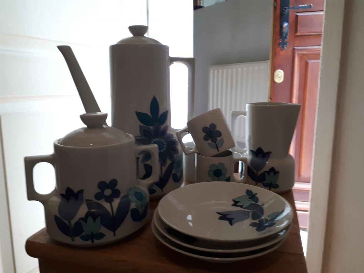 Service à café blanc à motifs floraux bleus. Cafetière , sucrier , pot de lait , tasses et soucoupes