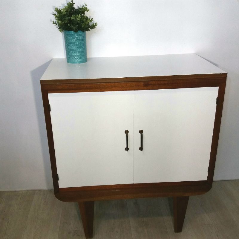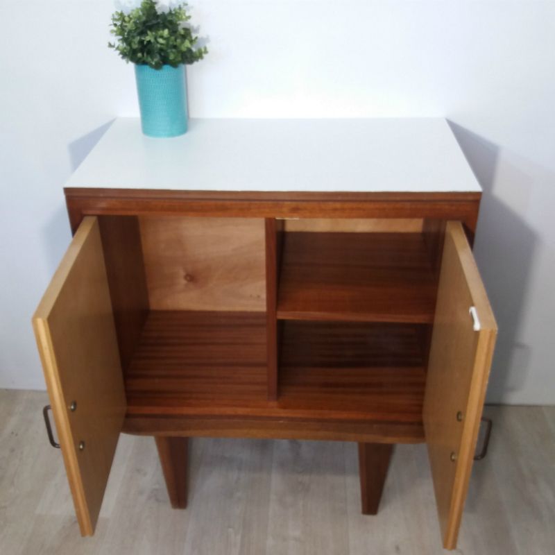 Petit buffet des années 50. Les deux portes et le plateau ont été peints en blanc, pour un peu plus de modernité et ses grands pieds élancés, lui donne une ligne plus aérienne. Il trouvera à coup sûre, sa place dans tous les intérieurs, même les plus petits.