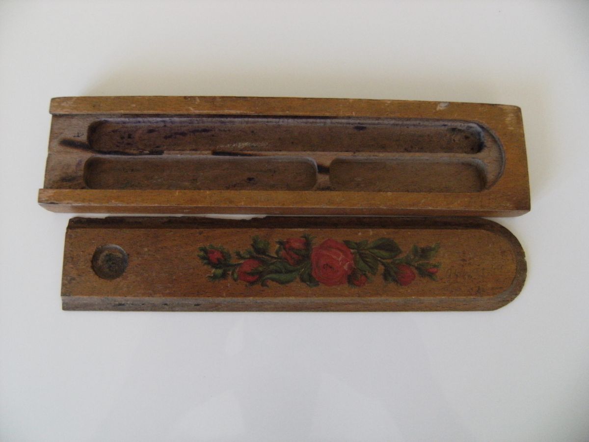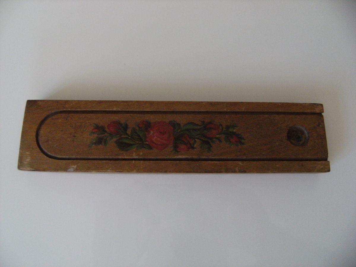 Ancien Plumier d'écolier en bois ,motif "roses" ,3 compartiments creusés . Objet ayant vécus avec traces d'usures dues au temps et utilisation .Reste un très bel objet nostalgique d'écolier dantan.
