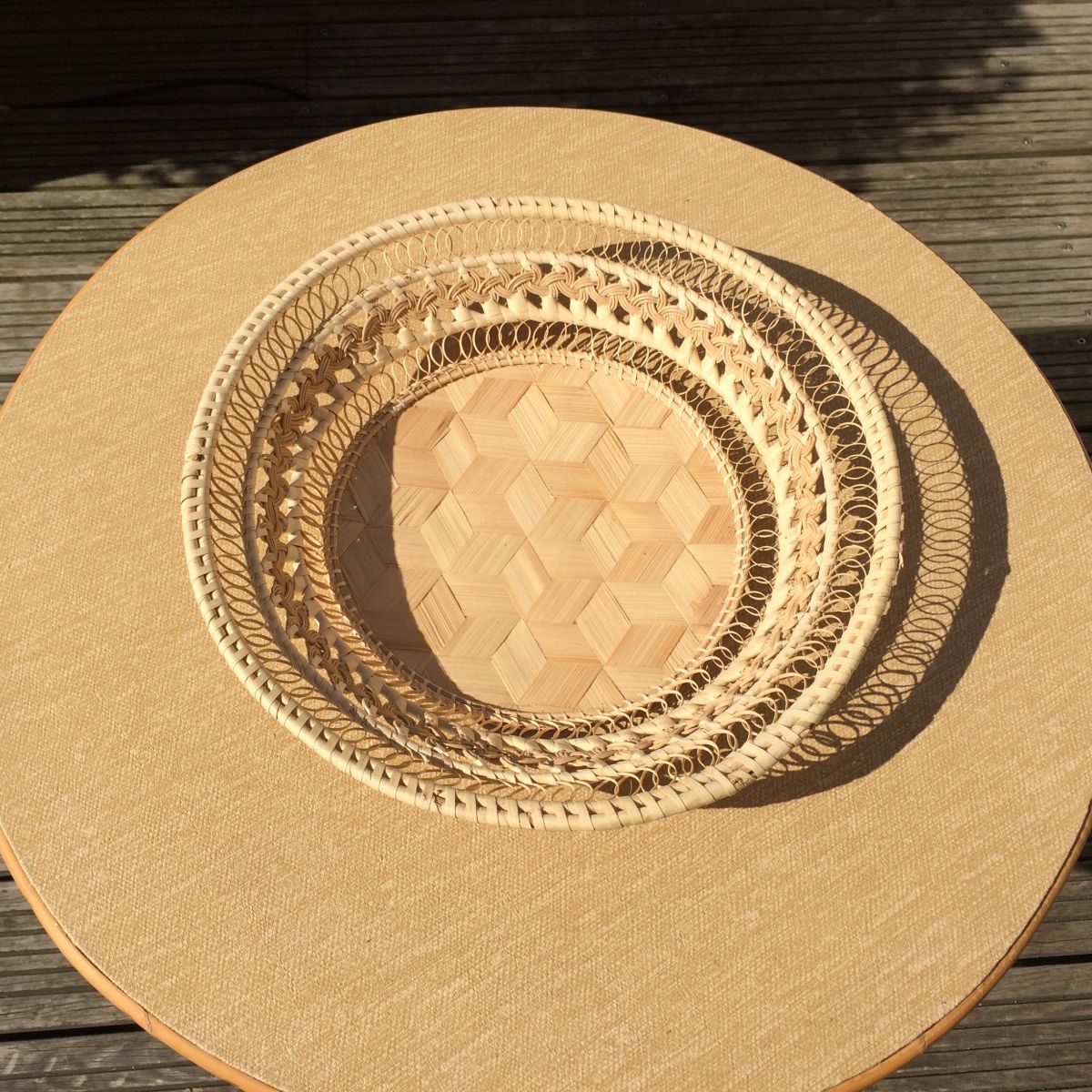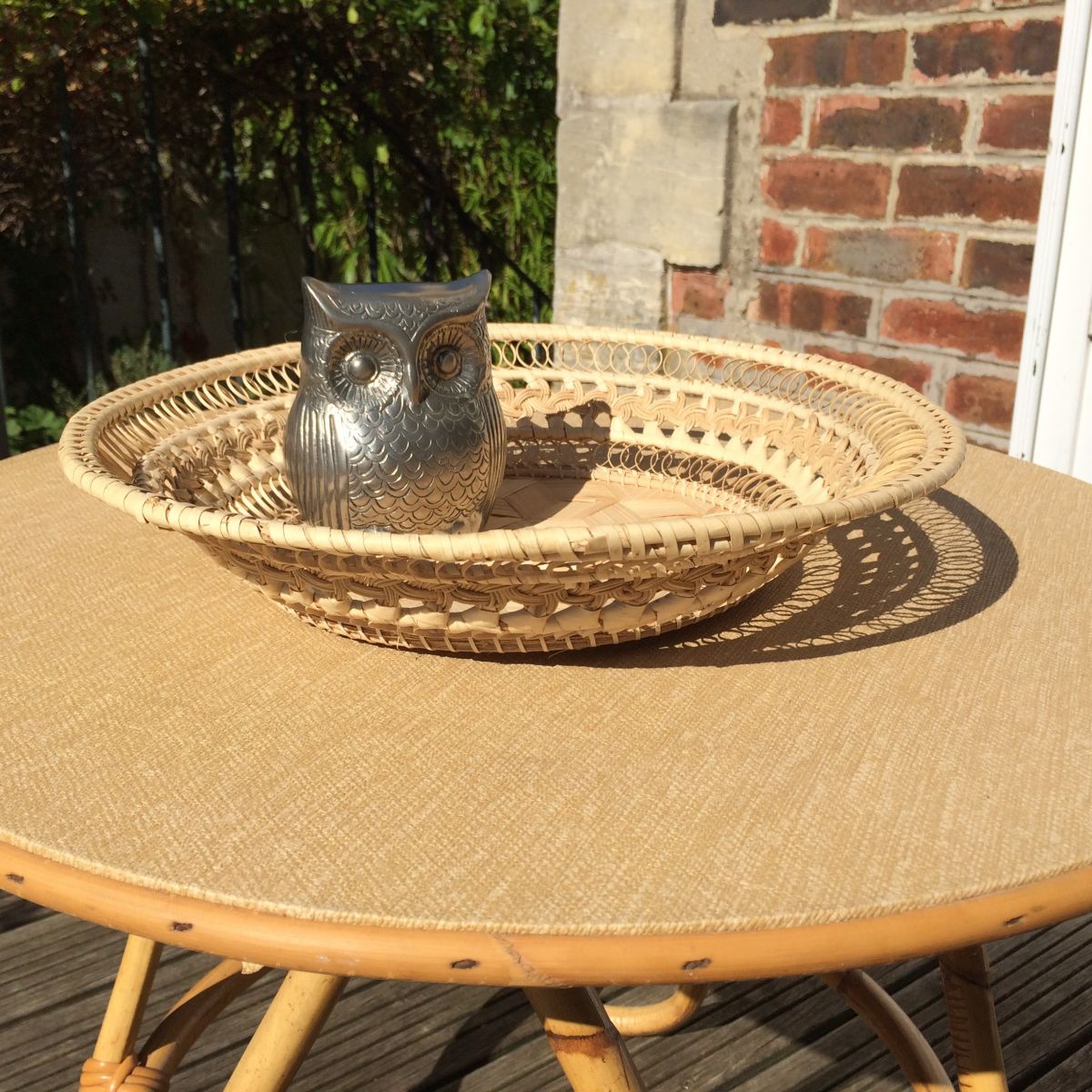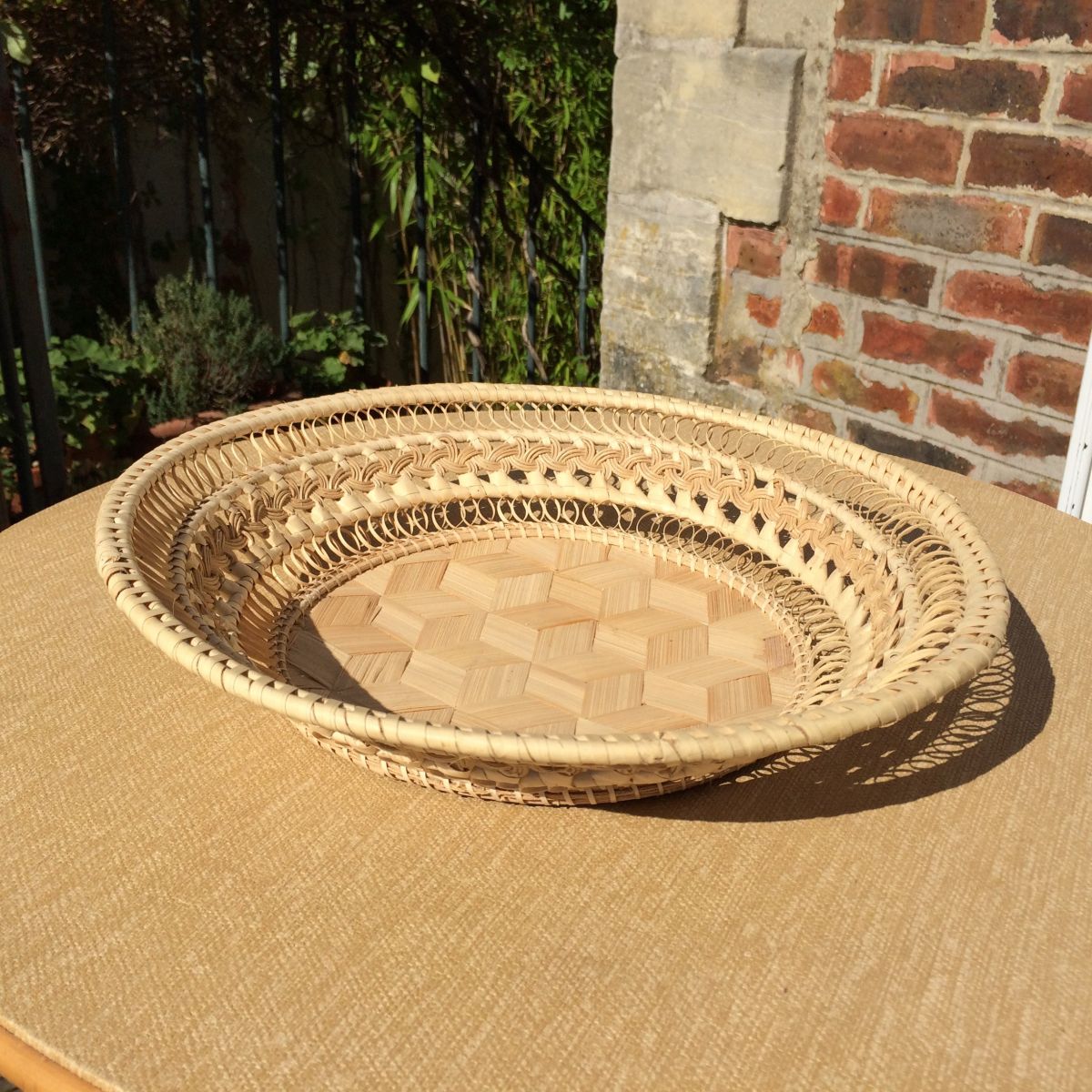 Corbeille en rotin clair joliment tressé, à utiliser en vide-poches ou en déco murale.