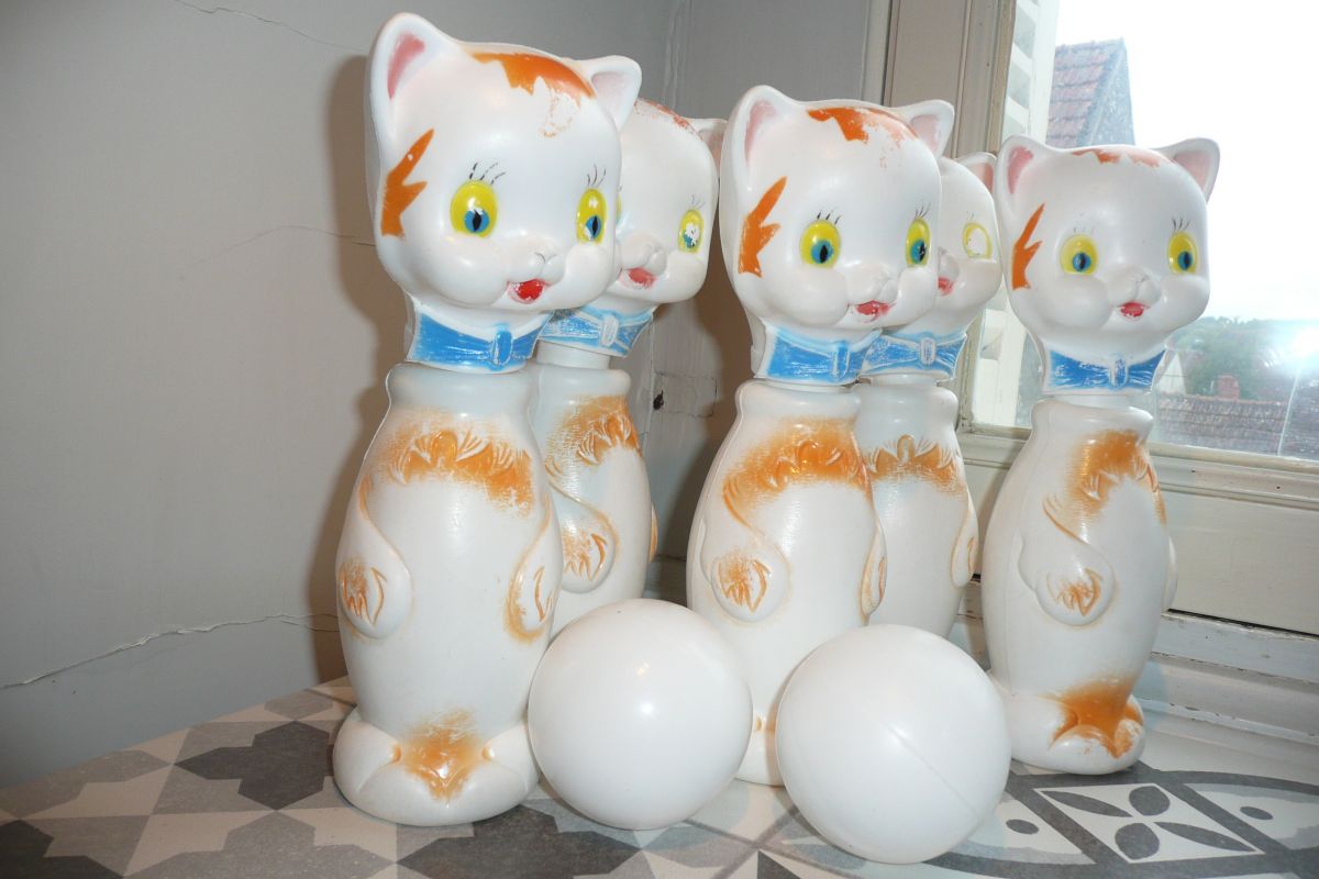 jeu de quilles vintage plastique chat