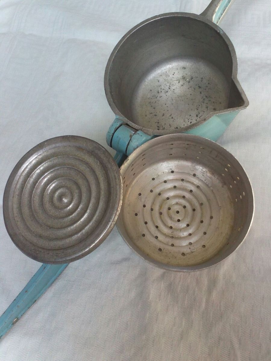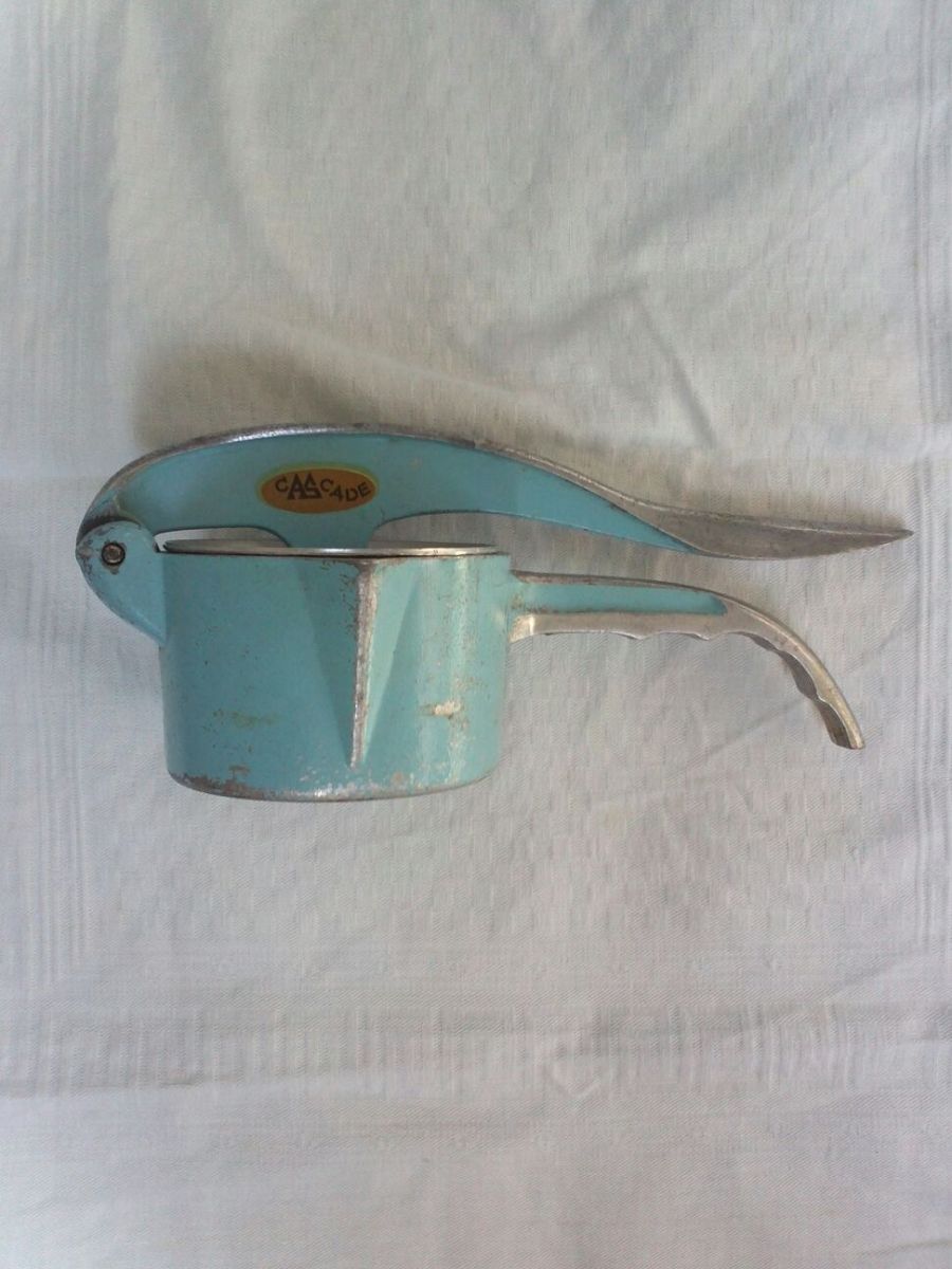 presse agrumes de la marque" cascade" datant des années 1960, couleur bleue d'origine, en métal (certaine partie en aluminium) , trace d'usage mais en bon état pour son age.