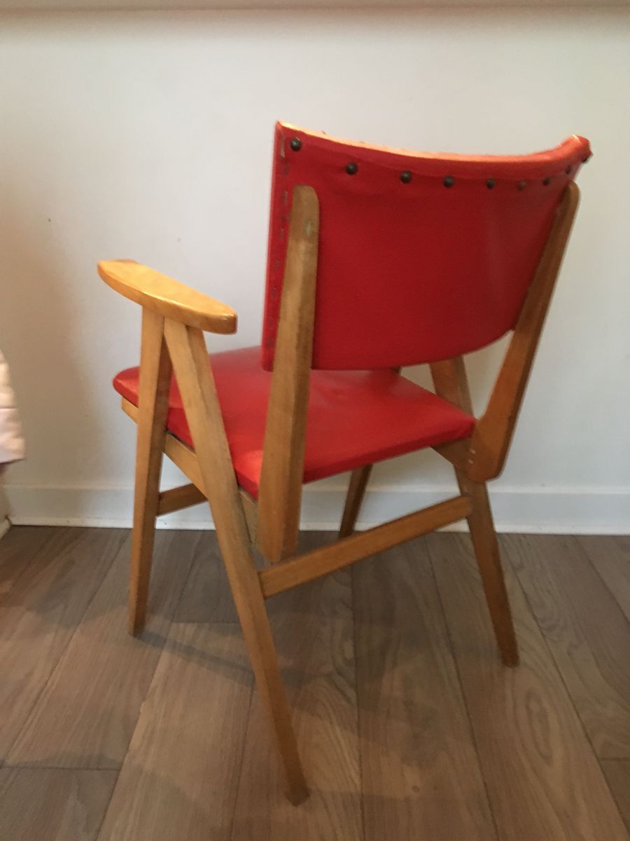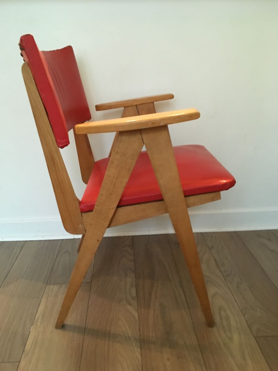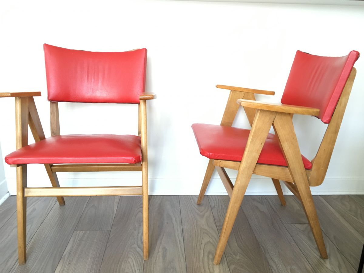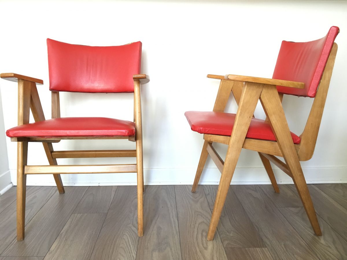 Paire de fauteuils en bois ( chêne ) et skai rouge.