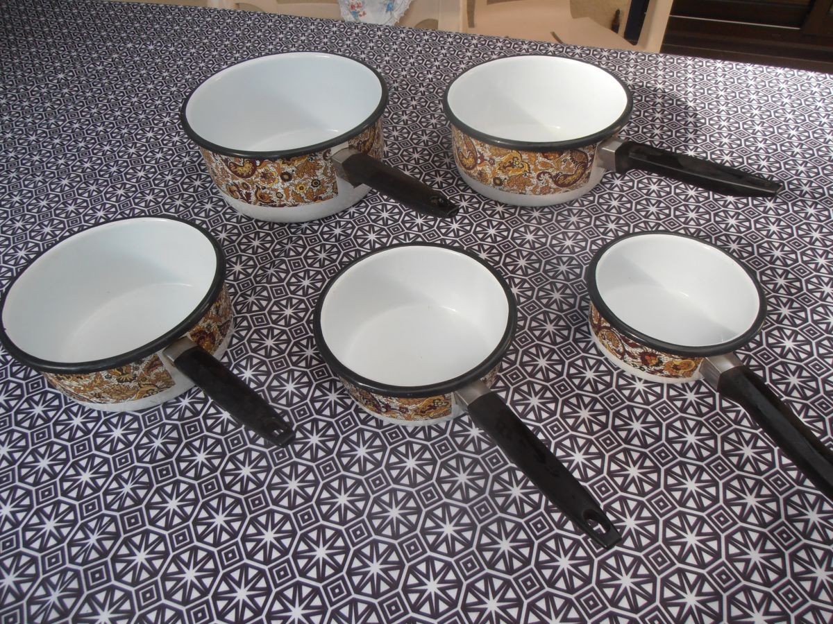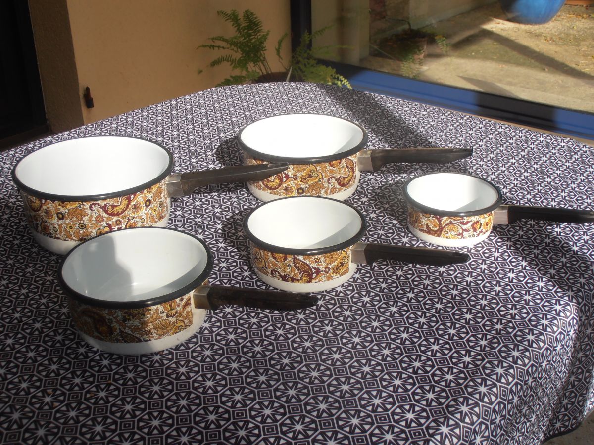 Bonjour, je vous propose cette belle série de casseroles, originale des années 70: avec un motif cachemire, cette série de 5 casseroles émaillées, avec ses couleurs marron et jaune est automnale!