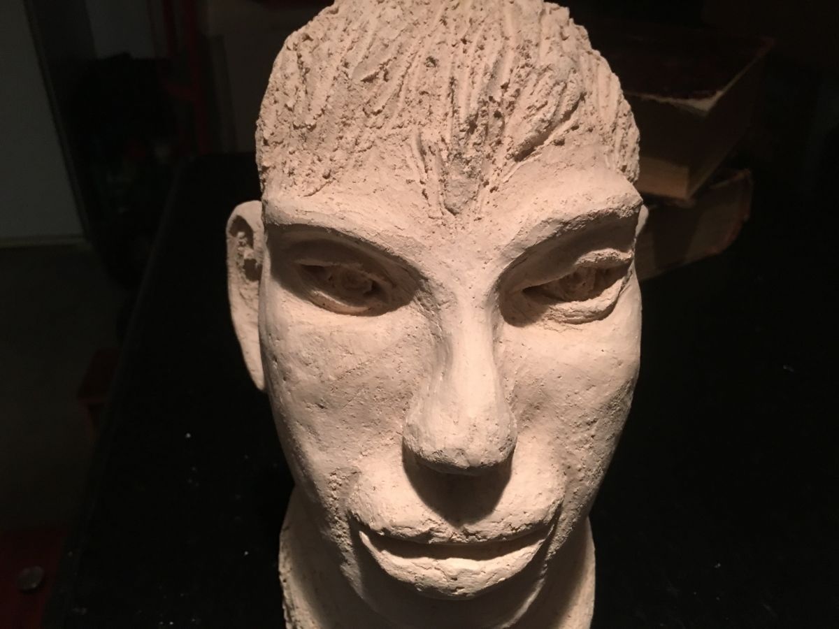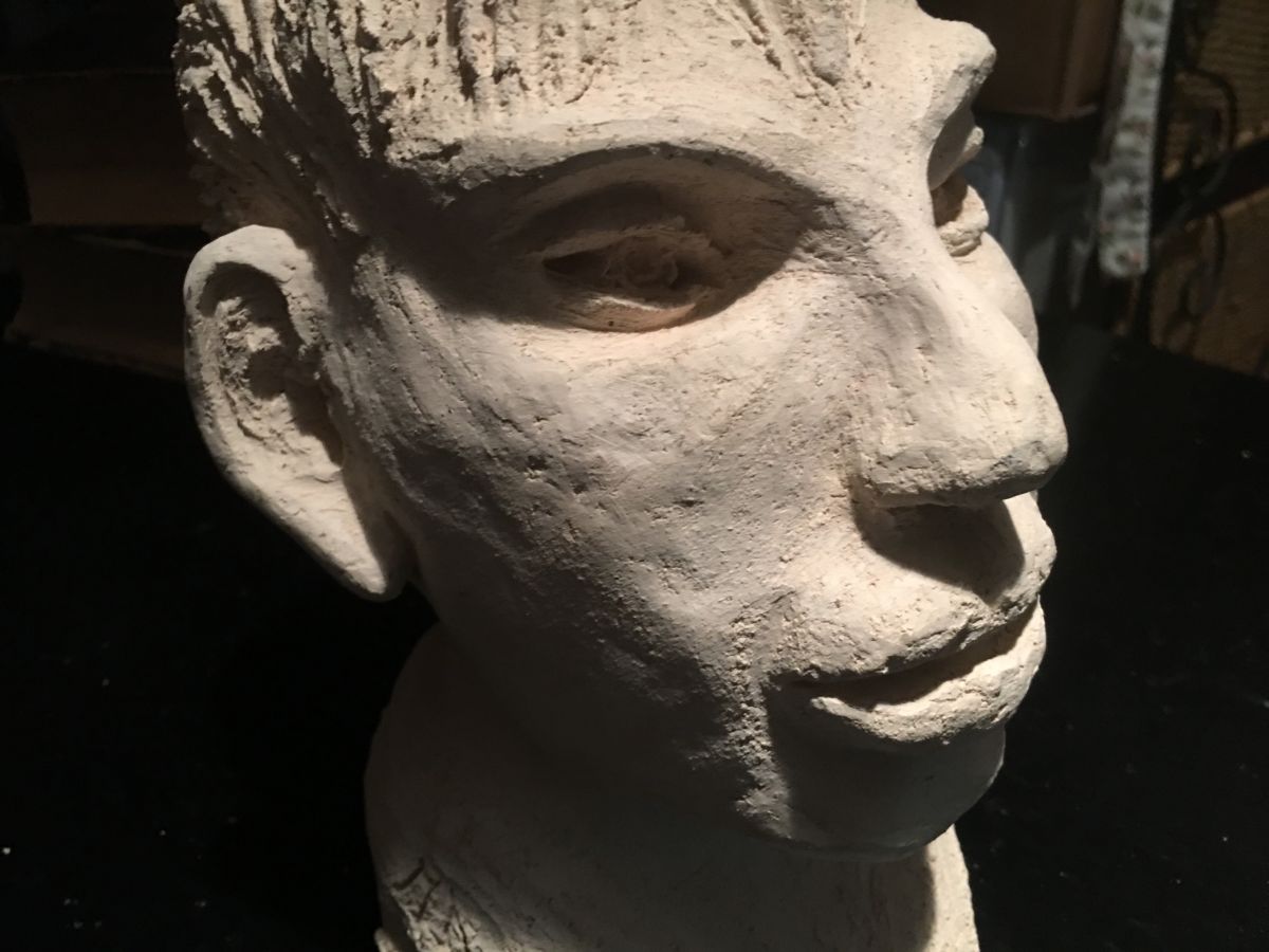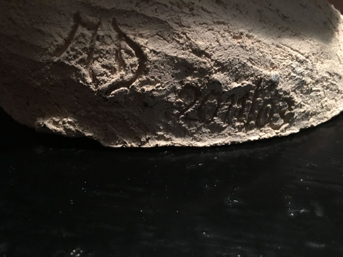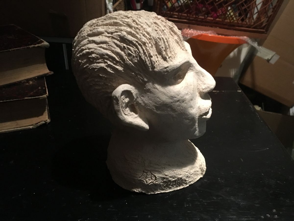 Tête en pierre, signée et datée sur le côté (JD 2011/03), hauteur 24cm, largeur 13cm, profondeur 17cm, bon état.