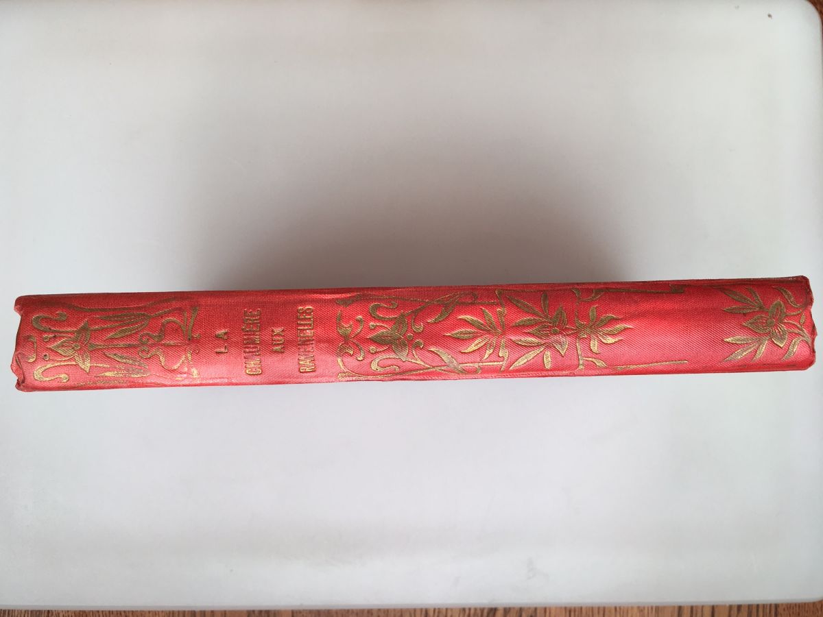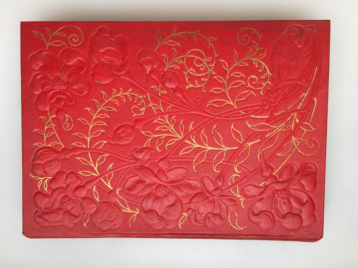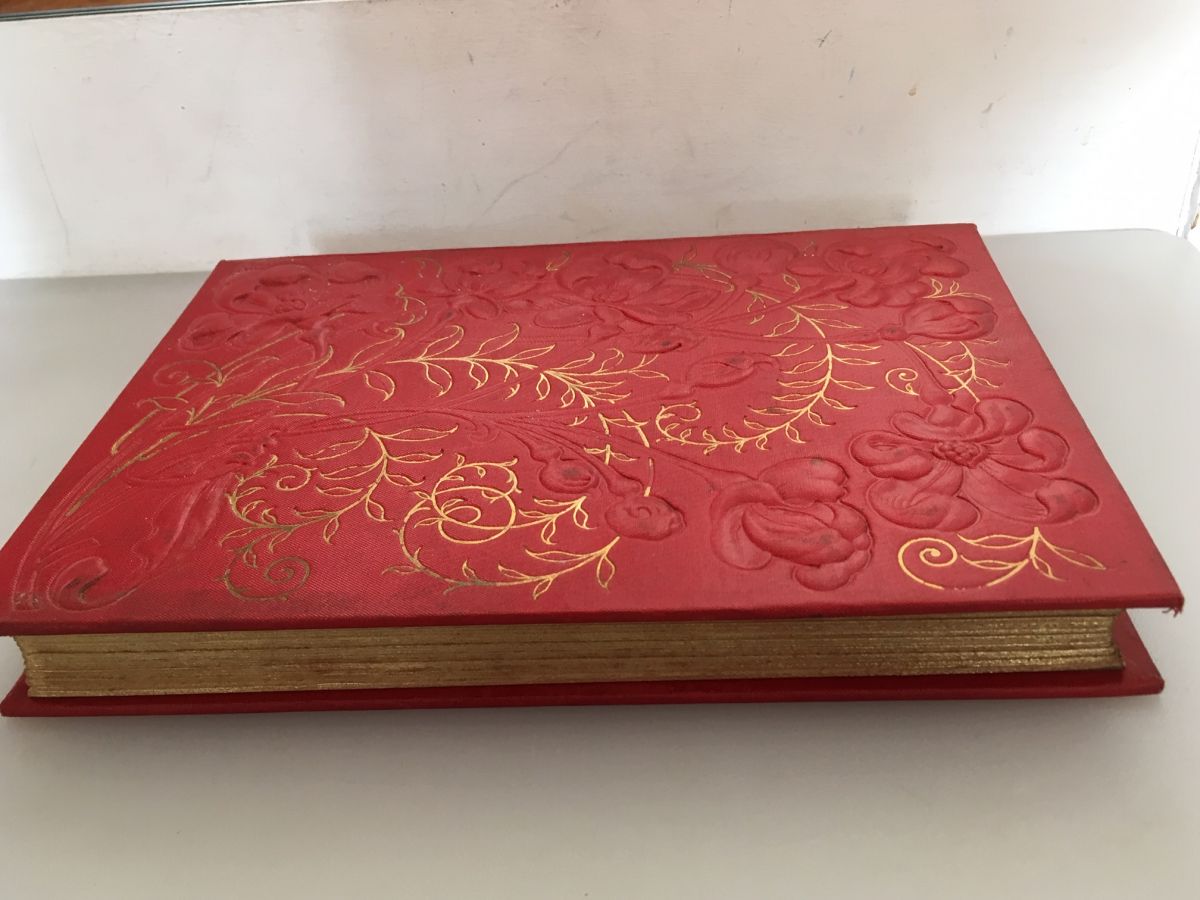 Reliure rouge en relief avec motifs et lettres dorées. Tranche dorée