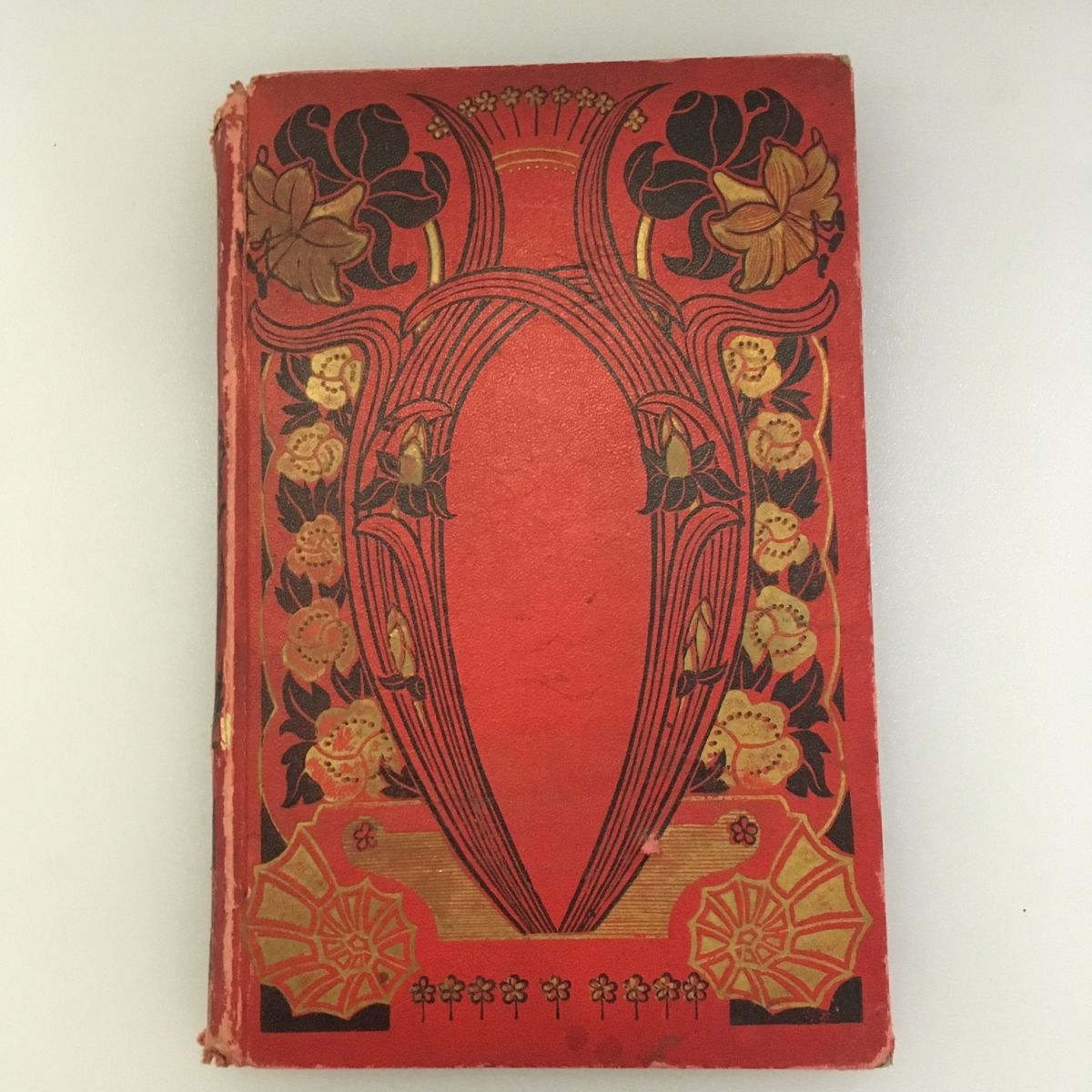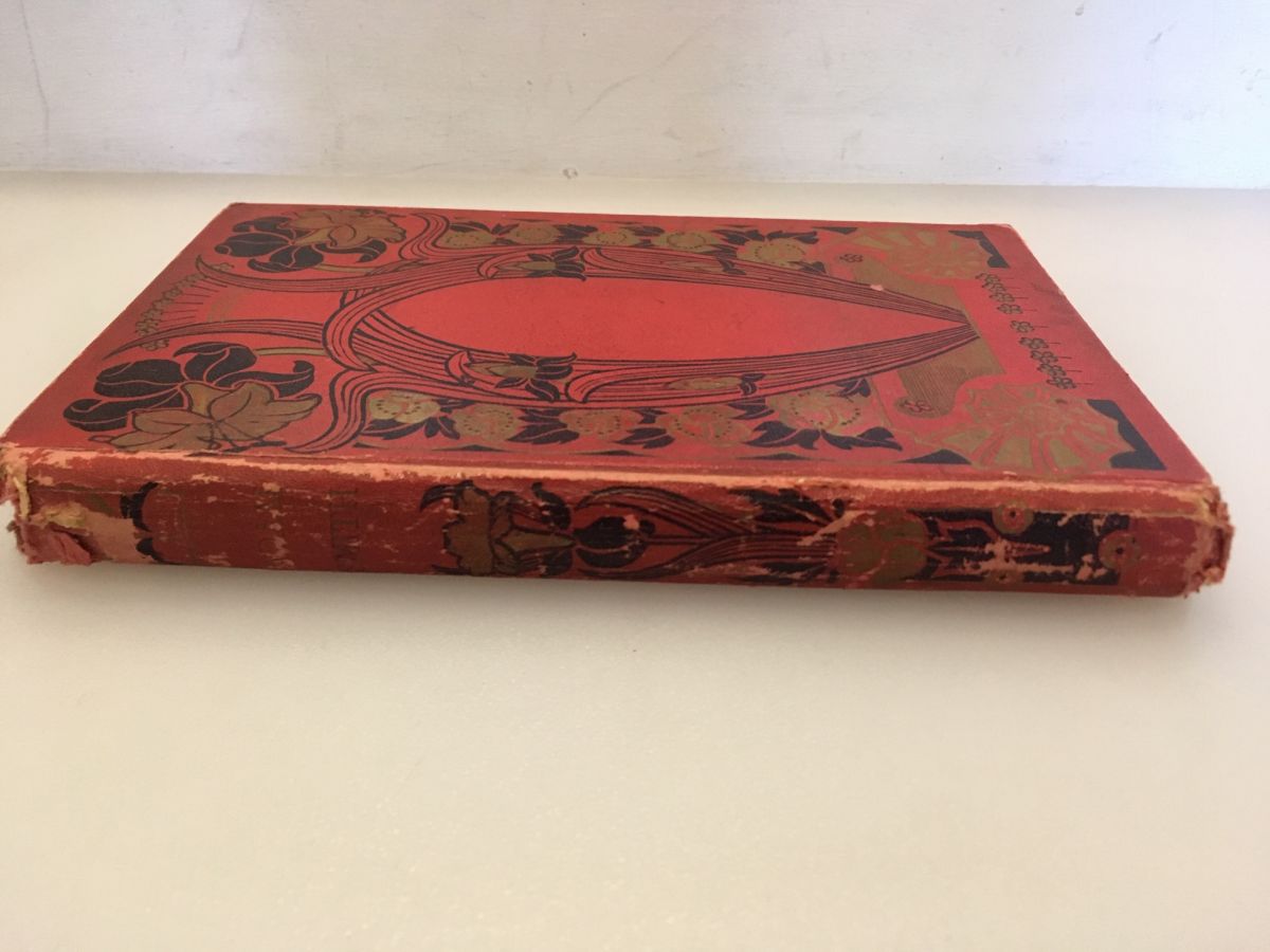 Couverture rouge avec dessins noir et or. Complet. Couverture endommagée, pages jaunies.