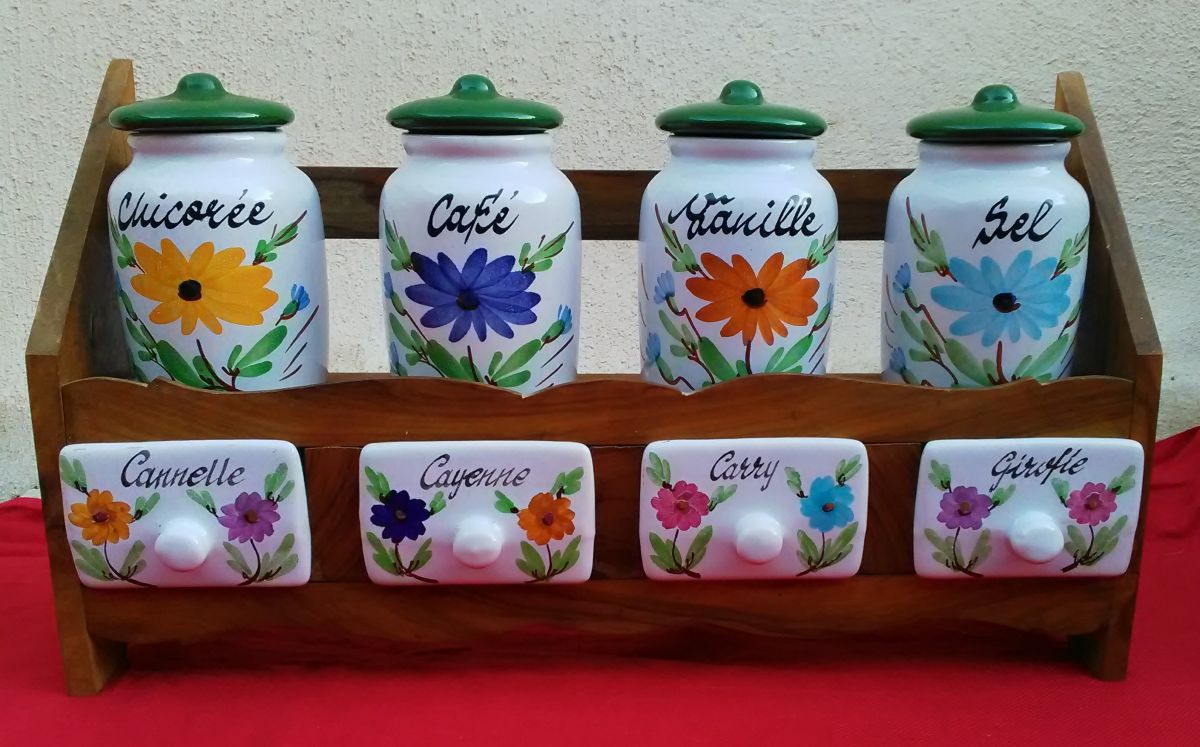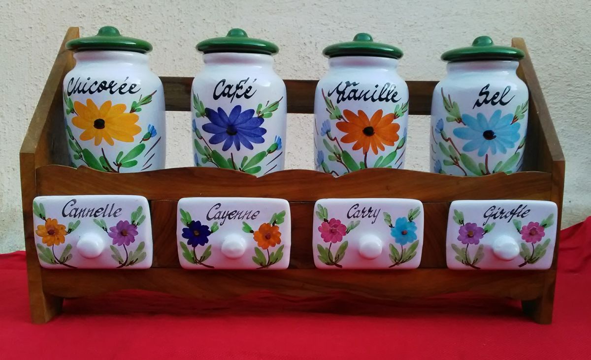 Jolie étagère à épices en bois et ses pots en céramique