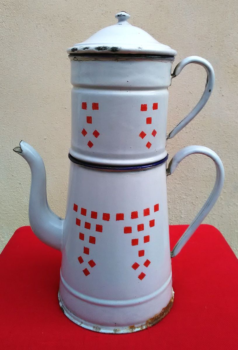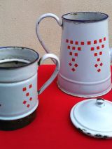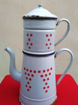 Grande cafetière émaillée blanche à damiers rouge (Années 20