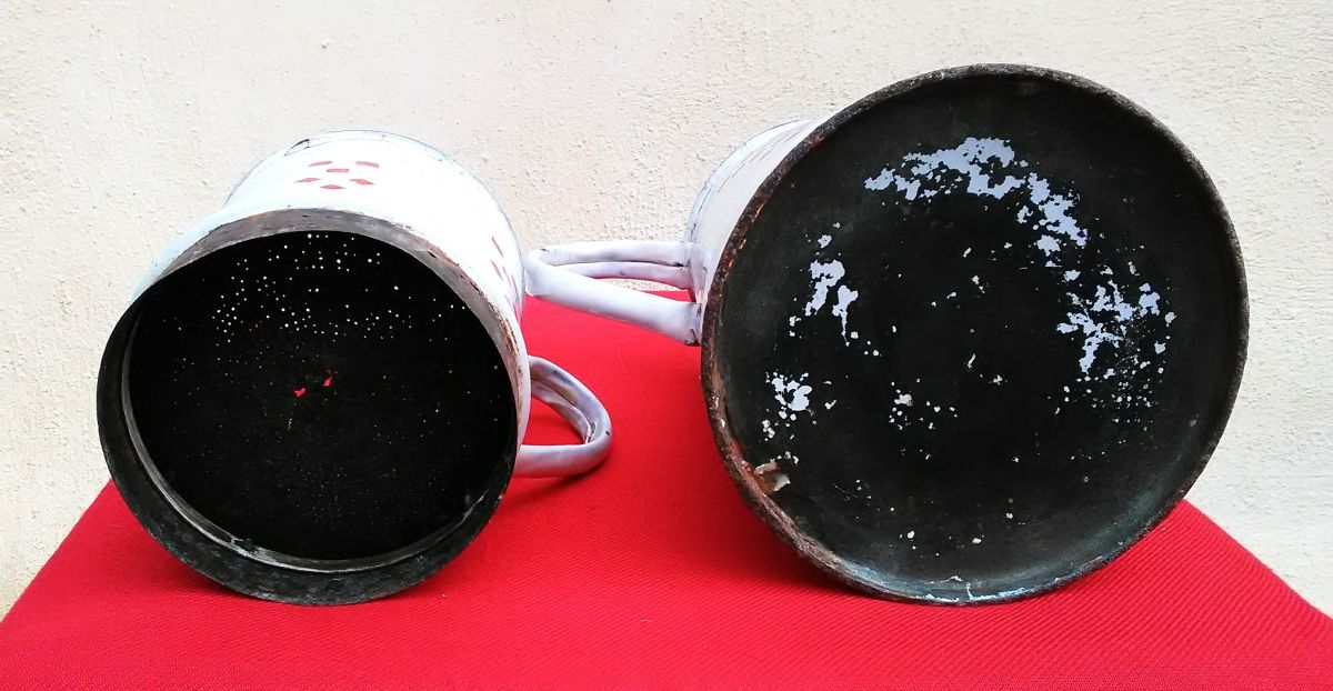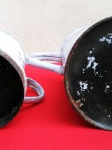 La cafetière est complète avec son filtre et son couvercle. Comme tt objet ancien en tôle émaillée, elle a des traces de son histoire (sauts d'émail ... ), mais n'est-ce pas là justement tout le charme de ces objets, leurs histoires.