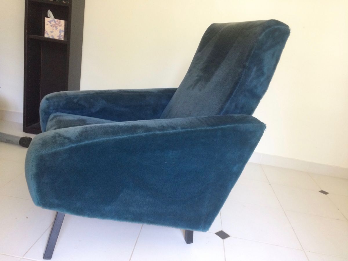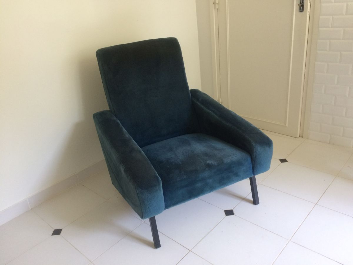 Magnifique fauteuil vintage en velours bleu canard des années 60. Pieds en métal noir. très bon état.