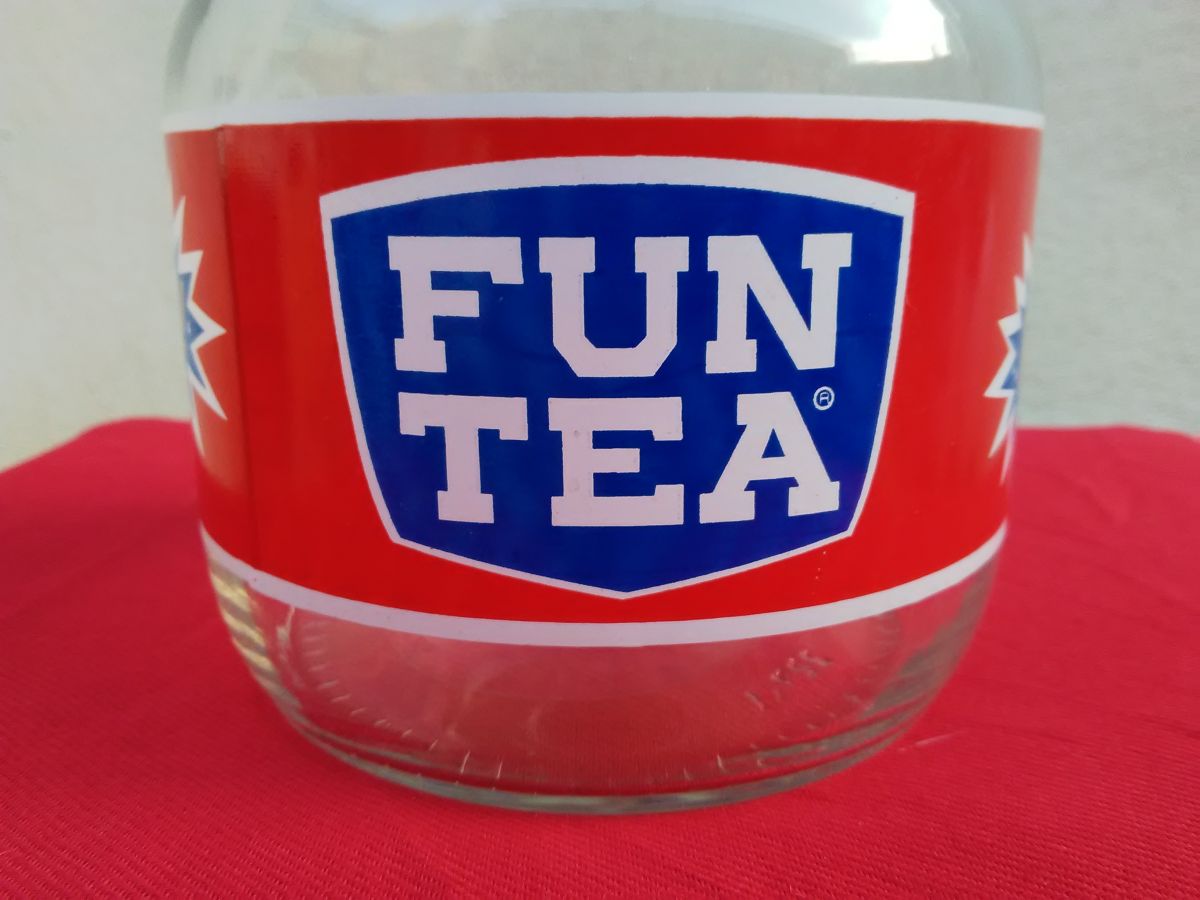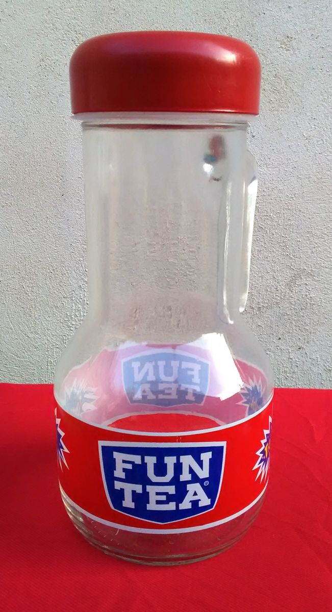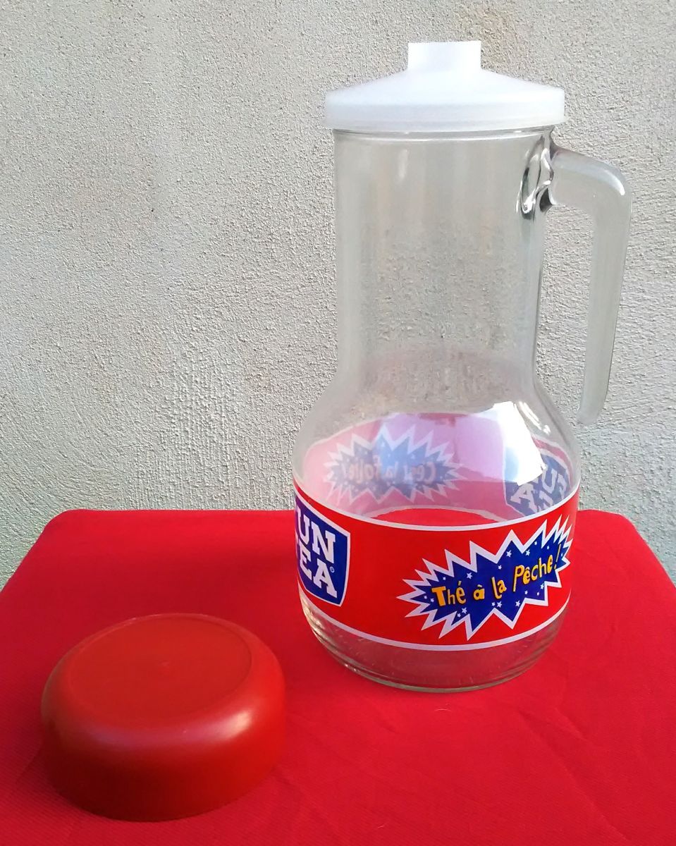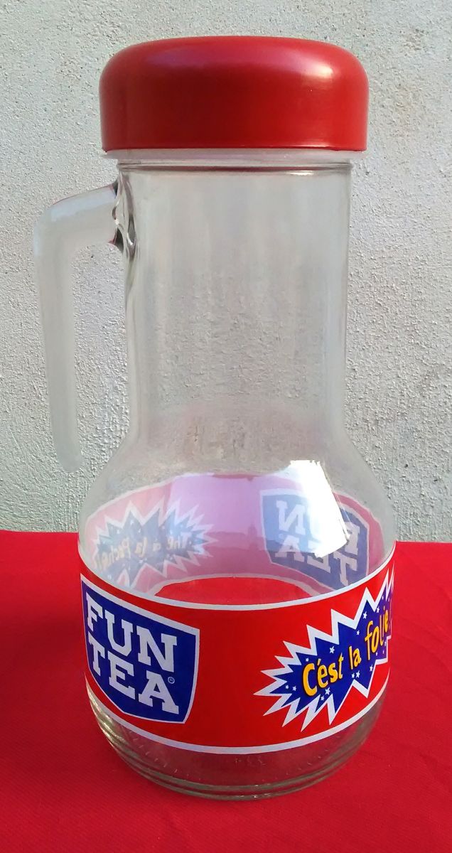 Grand pichet publicitaire "FunTea" (le thé à la pêche) avec verseuse et couvercle.