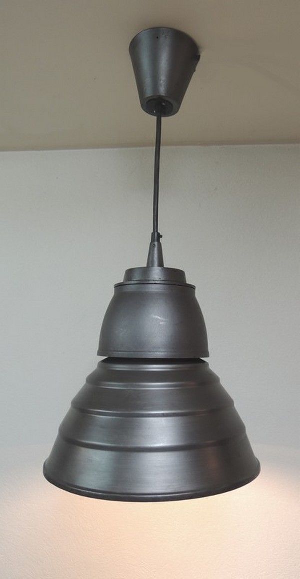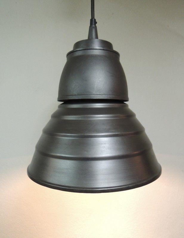 Ancienne suspension d'entrepôt restaurée pour un usage domestique, en alu et fonte d'alu patinée gris anthracite brillant, excellent état, pavillon conique avec accroche, électricité révisée, câble 3G2.5 sur longueur de 1.5 ml. Hauteur 42 cm x diamètre 35 cm. Poids colis 4,2 kg